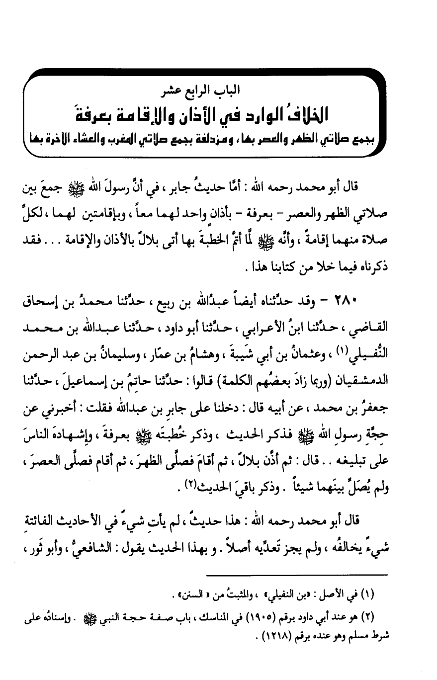 §الْبَابُ الرَّابِعَ عَشَرَ: الْخِلَافُ الْوَارِدُ فِي الْأَذَانِ وَالْإِقَامَةِ بِعَرَفَةَ بِجَمْعِ صَلَاتَيِ الظُّهْرِ وَالْعَصْرِ بِهَا وَمُزْدَلِفَةَ بِجَمْعِ صَلَاتَيِ الْمَغْرِبِ وَالْعِشَاءِ الْآخِرَةِ بِهَا قَالَ أَبُو مُحَمَّدٍ رَحِمَهُ اللَّهُ: أَمَّا حَدِيثُ جَابِرٍ فِي أَنَّ رَسُولَ اللَّهِ صَلَّى اللهُ عَلَيْهِ وَسَلَّمَ جَمَعَ بَيْنَ صَلَاتَيِ الظُّهْرِ وَالْعَصْرِ بِعَرَفَةَ بِأَذَانٍ وَاحِدٍ لَهُمَا مَعًا وَبِإِقَامَتَيْنِ لَهُمَا، لِكُلِّ صَلَاةٍ مِنْهُمَا إِقَامَةٌ، وَأَنَّهُ صَلَّى اللهُ عَلَيْهِ وَسَلَّمَ لَمَّا أَتَمَّ الْخُطْبَةَ بِهَا أَتَى بِلَالٌ بِالْأَذَانِ وَالْإِقَامَةِ فَقَدْ ذَكَرْنَاهُ فِيمَا خَلَا مِنْ كِتَابِنَا هَذَا