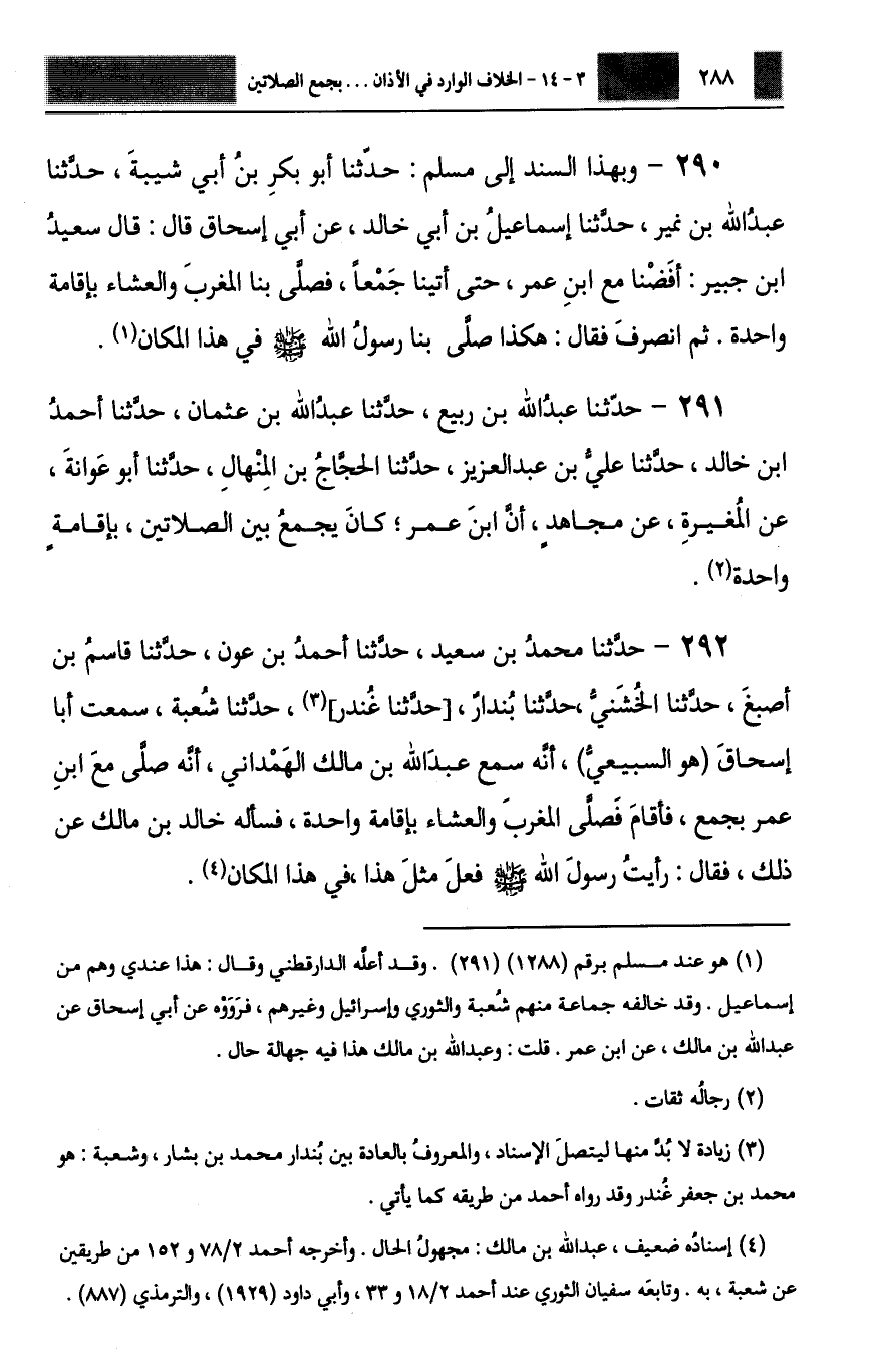 290 - وَبِهَذَا السَّنَدِ إِلَى مُسْلِمٍ: حَدَّثَنَا أَبُو بَكْرِ بْنُ أَبِي شَيْبَةَ، حَدَّثَنَا عَبْدُ اللَّهِ بْنُ نُمَيْرٍ، حَدَّثَنَا إِسْمَاعِيلُ بْنُ أَبِي خَالِدٍ، عَنْ أَبِي إِسْحَاقَ، قَالَ: قَالَ سَعِيدُ بْنُ جُبَيْرٍ: أَفَضْنَا مَعَ ابْنِ عُمَرَ حَتَّى أَتَيْنَا جَمْعًا، §فَصَلَّى بِنَا الْمَغْرِبَ وَالْعِشَاءَ بِإِقَامَةٍ وَاحِدَةٍ، ثُمَّ انْصَرَفَ، فَقَالَ: هَكَذَا صَلَّى بِنَا رَسُولُ اللَّهِ صَلَّى اللهُ عَلَيْهِ وَسَلَّمَ فِي هَذَا الْمَكَانِ