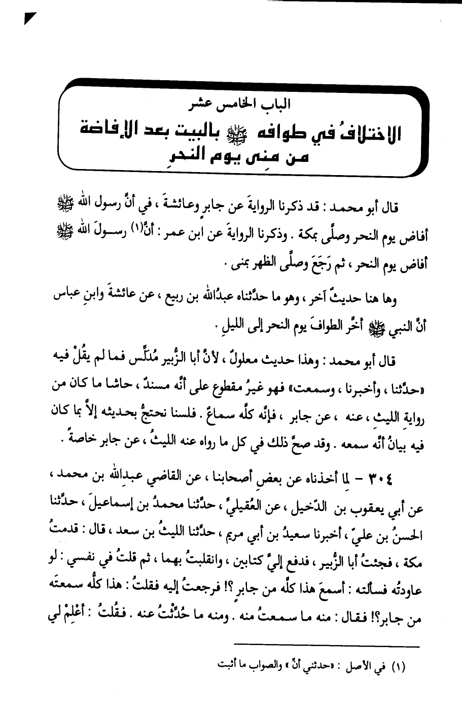 §الْبَابُ الْخَامِسَ عَشَرَ: الِاخْتِلَافُ فِي طَوَافِهِ صَلَّى اللهُ عَلَيْهِ وَسَلَّمَ بِالْبَيْتِ بَعْدَ الْإِفَاضَةِ مِنْ مِنًى يَوْمَ النَّحْرِ قَالَ أَبُو مُحَمَّدٍ: قَدْ ذَكَرْنَا الرِّوَايَةَ عَنْ جَابِرٍ وَعَائِشَةَ فِي أَنَّ رَسُولَ اللَّهِ صَلَّى اللهُ عَلَيْهِ وَسَلَّمَ أَفَاضَ يَوْمَ النَّحْرِ، وَصَلَّى بِمَكَّةَ، وَذَكَرِنَا الرِّوَايَةَ عَنِ ابْنِ عُمَرَ أَنَّ رَسُولَ اللَّهِ صَلَّى اللهُ عَلَيْهِ وَسَلَّمَ أَفَاضَ يَوْمَ النَّحْرِ، ثُمَّ رَجَعَ وَصَلَّى الظُّهْرَ بِمِنًى. وَهَا هُنَا حَدِيثٌ آخَرُ وَهُوَ مَا حَدَّثَنَاهُ عَبْدُ اللَّهِ بْنُ رَبِيعٍ عَنْ عَائِشَةَ وَابْنِ عَبَّاسٍ أَنَّ النَّبِيَّ صَلَّى اللهُ عَلَيْهِ وَسَلَّمَ أَخَّرَ الطَّوَافَ يَوْمَ النَّحْرِ إِلَى اللَّيْلِ. قَالَ أَبُو مُحَمَّدٍ: وَهَذَا حَدِيثٌ مَعْلُولٌ؛ لِأَنَّ أَبَا الزُّبَيْرِ مُدَلِّسٌ فَمَا لَمْ يُقَلْ فِيهِ: حَدَّثَنَا وَأَخْبَرَنَا وَسَمِعْتُ فَهُوَ غَيْرُ مَقْطُوعٍ عَلَى أَنَّهُ مُسْنَدٌ حَاشَا مَا كَانَ مِنْ رِوَايَةِ اللَّيْثِ عَنْهُ عَنْ جَابِرٍ، فَإِنَّهُ كُلُّهُ سَمَاعٌ. فَلَسْنَا نَحْتَجُّ بِحَدِيثِهِ إِلَّا بِمَا كَانَ فِيهِ بَيَانُ أَنَّهُ سَمِعَهُ، وَقَدْ صَحَّ ذَلِكَ فِي كُلِّ مَا رَوَاهُ عَنْهُ اللَّيْثُ عَنْ جَابِرٍ خَاصَّةً.