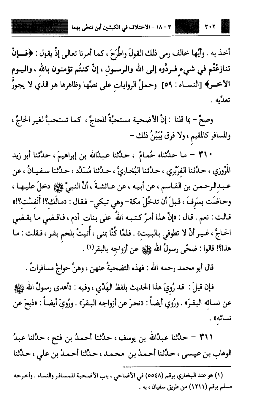 310 - مَا حَدَّثَنَاهُ حُمَامٌ، حَدَّثَنَا عَبْدُ اللَّهِ بْنُ إِبْرَاهِيمَ، حَدَّثَنَا أَبُو زَيْدٍ الْمَرْوَزِيُّ، حَدَّثَنَا الْفَرَبْرِيُّ، حَدَّثَنَا الْبُخَارِيُّ، حَدَّثَنَا مُسَدَّدٌ، حَدَّثَنَا سُفْيَانُ، عَنْ عَبْدِ الرَّحْمَنِ بْنِ الْقَاسِمِ، عَنْ أَبِيهِ، عَنْ عَائِشَةَ، أَنَّ النَّبِيَّ صَلَّى اللهُ عَلَيْهِ وَسَلَّمَ دَخَلَ عَلَيْهَا وَحَاضَتْ بِسَرِفَ قَبْلَ أَنْ تَدْخُلَ مَكَّةَ، وَهِيَ تَبْكِي فَقَالَ: «مَا لَكِ أَنَفِسْتِ» ؟ قَالَتْ: نَعَمْ، قَالَ: §«إِنَّ هَذَا أَمْرٌ كَتَبَهُ اللَّهُ عَلَى بَنَاتِ آدَمَ فَاقْضِي مَا يَقْضِي الْحَاجُّ غَيْرَ أَنْ لَا تَطُوفِي بِالْبَيْتِ» فَلَمَّا كُنَّا بِمِنًى أُتِيتُ بِلَحْمِ بَقَرٍ، فَقُلْتُ: مَا هَذَا؟ قَالُوا: ضَحَّى رَسُولُ اللَّهِ صَلَّى اللهُ عَلَيْهِ وَسَلَّمَ عَنْ أَزْوَاجِهِ بِالْبَقَرِ. قَالَ أَبُو مُحَمَّدٍ رَحِمَهُ اللَّهُ: فَهَذِهِ التَّضْحِيَةُ عَنْهُنَّ وَهُنَّ حَوَاجٌّ مُسَافِرَاتٌ، فَإِنْ قِيلَ: قَدْ رُوِيَ هَذَا الْحَدِيثُ بِلَفْظِ الْهَدْيِ، وَفِيهِ: أَهْدَى رَسُولُ اللَّهِ صَلَّى اللهُ عَلَيْهِ وَسَلَّمَ عَنْ نِسَائِهِ الْبَقَرَ، وَرُوِيَ أَيْضًا: نَحَرَ عَنْ أَزْوَاجِهِ الْبَقَرَ، وَرُوِيَ أَيْضًا: ذَبَحَ عَنْ نِسَائِهِ