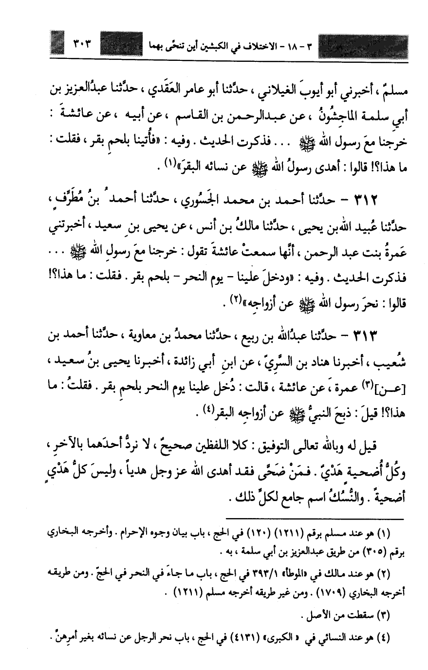 313 - حَدَّثَنَا عَبْدُ اللَّهِ بْنُ رَبِيعٍ، حَدَّثَنَا مُحَمَّدُ بْنُ مُعَاوِيَةَ، حَدَّثَنَا أَحْمَدُ بْنُ شُعَيْبٍ، أَخْبَرَنَا هَنَّادُ بْنُ السَّرِيِّ، عَنِ ابْنِ أَبِي زَائِدَةَ، أَخْبَرَنَا يَحْيَى بْنُ سَعِيدٍ، عَنْ عَمْرَةَ، عَنْ عَائِشَةَ، قَالَتْ: §دُخِلَ عَلَيْنَا يَوْمَ النَّحْرِ بِلَحْمِ بَقَرٍ، فَقُلْتُ: مَا هَذَا؟ قِيلَ: ذَبَحَ النَّبِيُّ صَلَّى اللهُ عَلَيْهِ وَسَلَّمَ عَنْ أَزْوَاجِهِ الْبَقَرَ قِيلَ لَهُ وَبِاللَّهِ تَعَالَى التَّوْفِيقُ: كِلَا اللَّفْظَيْنِ صَحِيحٌ، لَا نَرُدُّ أَحَدَهُمَا بِالْآخَرِ، وَكُلُّ أُضْحِيَّةٍ هَدْيٌ فَمَنْ ضَحَّى فَقَدْ أَهْدَى اللَّهَ عَزَّ وَجَلَّ هَدْيًا، وَلَيْسَ كُلُّ هَدْيٍ أُضْحِيَّةً، وَالنُّسُكُ اسْمٌ جَامِعٌ لِكُلِّ ذَلِكَ -[304]-. وَأَيْضًا فَإِنَّ سُفْيَانَ ذَكَرَ التَّضْحِيَةَ زَائِدَةَ مَعْنًى، لَيْسَ فِي رِوَايَةِ الْمَاجِشُونِ عَنْ عَبْدِ الرَّحْمَنِ إِذْ قَالَ: أَهْدَى، وَلَا رِوَايَةِ عَمْرَةَ إِذْ قَالَتْ: نَحَرَ رَسُولُ اللَّهِ صَلَّى اللهُ عَلَيْهِ وَسَلَّمَ. وَالزَّائِدُ فِي الْمَعْنَى زَائِدٌ عِلْمًا، وَسُنَّةٌ يَلْزَمُ الْأَخْذُ بِهَا. وَبِالْجُمْلَةِ فَلَا يَحِلُّ لِأَحَدٍ التَّعَلُّقُ بِلَفْظِ حَدِيثٍ صَحِيحٍ دُونَ لَفْظٍ آخَرَ صَحِيحٍ وَرَدَ فِي ذَلِكَ الْحَدِيثِ وَالْوَاجِبُ أَنْ يُسْتَعْمَلَ كُلُّ ذَلِكَ وَيُؤْخَذُ بِجَمِيعِهِ، وَلَا يُضْرَبُ بَعْضُهُ بِبَعْضٍ، فَكُلُّ ذَلِكَ مُؤْتَلِفٌ لَا اخْتِلَافَ فِيهِ؛ لِأَنَّهُ كُلَّهُ وَحْيٌ، قَالَ تَعَالَى مُخْبِرًا عَنْ نَبِيِّهِ صَلَّى اللهُ عَلَيْهِ وَسَلَّمَ {وَمَا يَنْطِقُ عَنِ الْهَوَى إِنْ هُوَ إِلَّا وَحْيٌ يُوحَى عَلَّمَهُ شَدِيدُ الْقُوَى} [النجم: 4] ، وَقَالَ تَعَالَى {وَلَوْ كَانَ مِنْ عِنْدِ غَيْرِ اللَّهِ لَوَجَدُوا فِيهِ اخْتِلَافًا كَثِيرًا} [النساء: 82] ، فَصَحَّ أَنَّهُ لَا اخْتِلَافَ فِي شَيْءٍ بِمَا جَاءَ عَنْهُ عَلَيْهِ السَّلَامُ، وَأَنَّهُ كُلَّهُ مُتَّفِقٌ. وَقَدْ رُوِيَ فِي هَذَا أَيْضًا حَدِيثٌ لَسْنَا نُورِدُهُ عَلَى سَبِيلِ الِاحْتِجَاجِ بِهِ؛ لِأَنَّ سَنَدَهُ لَيْسَ مِمَّا نَسْتَجِيزُ أَنْ نَجْعَلَهُ حُجَّةً لَنَا وَلَا عَلَيْنَا، وَلَكِنْ نُورِدُهُ تَبْكِيتًا لِخُصُومِنَا؛ لِأَنَّهُمْ يَحْتَجُّونَ بِمِثْلِهِ إِذَا وَافَقَهُمْ