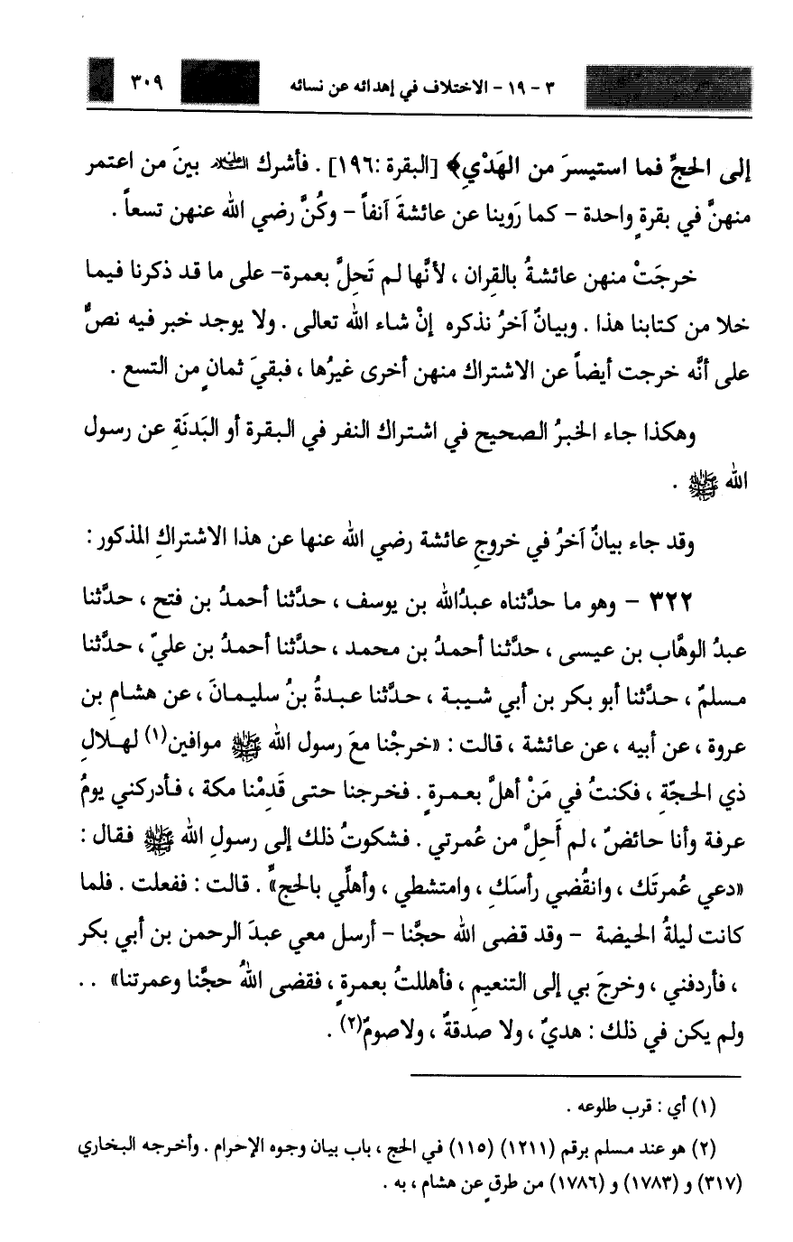 322 - وَهُوَ مَا حَدَّثَنَاهُ عَبْدُ اللَّهِ بْنُ يُوسُفَ، حَدَّثَنَا أَحْمَدُ بْنُ فَتْحٍ، حَدَّثَنَا عَبْدُ الْوَهَّابِ بْنُ عِيسَى، حَدَّثَنَا أَحْمَدُ بْنُ مُحَمَّدٍ، حَدَّثَنَا أَحْمَدُ بْنُ عَلِيٍّ، حَدَّثَنَا مُسْلِمٌ، حَدَّثَنَا أَبُو بَكْرِ بْنُ أَبِي شَيْبَةَ، حَدَّثَنَا عَبْدَةُ بْنُ سُلَيْمَانَ، عَنْ هِشَامِ بْنِ عُرْوَةَ، عَنْ أَبِيهِ، عَنْ عَائِشَةَ، قَالَتْ: خَرَجْنَا مَعَ رَسُولِ اللَّهِ صَلَّى اللهُ عَلَيْهِ وَسَلَّمَ مُوَافِينَ لِهِلَالِ ذِي الْحِجَّةِ، فَكُنْتُ فِي مَنْ أَهَلَّ بِعُمْرَةٍ، فَخَرَجْنَا حَتَّى قَدِمْنَا مَكَّةَ فَأَدْرَكَنِي يَوْمُ عَرَفَةَ، وَأَنَا حَائِضٌ لَمْ أَحِلَّ مِنْ عُمْرَتِي، فَشَكَوْتُ ذَلِكَ إِلَى رَسُولِ اللَّهِ صَلَّى اللهُ عَلَيْهِ وَسَلَّمَ فَقَالَ: «§دَعِي عُمْرَتَكِ، وَانْقُضِي رَأْسَكِ، وَامْتَشِطِي، وَأَهِلِّي بِالْحَجِّ» . قَالَتْ: فَفَعَلْتُ، فَلَمَّا كَانَتْ لَيْلَةُ الْحَيْضَةِ وَقَدْ قَضَى اللَّهُ حَجَّنَا أَرْسَلَ مَعِي عَبْدَ الرَّحْمَنِ بْنَ أَبِي بَكْرٍ، فَأَرْدَفَنِي، وَخَرَجَ بِي إِلَى التَّنْعِيمِ فَأَهْلَلْتُ بِعُمْرَةٍ، فَقَضَى اللَّهُ حَجَّنَا وَعُمْرَتَنَا، وَلَمْ يَكُنْ فِي ذَلِكَ هَدْيٌ وَلَا صَدَقَةٌ وَلَا صَوْمٌ -[310]- وَقَدْ صَحَّ أَنَّهَا لَمْ تَحِلَّ بِعُمْرَةٍ فَخَرَجَتْ عَنْ أَنْ يَكُونَ لَهَا حَظٌّ فِي الْبَقَرَةِ الْمُهْدَاةِ عَنِ الْمُعْتَمِرَاتِ مِنْ صَوَاحِبِهَا رَضِيَ اللَّهُ عَنْهُنَّ، وَصَحَّ بِهَذَا الْحَدِيثِ أَنَّهُ لَيْسَ يَلْزَمُ الْقَارِنَ مَا يَلْزَمُ الْمُتَمَتِّعَ. وَهَكَذَا رَوَاهُ ابْنُ نُمَيْرٍ، عَنْ هِشَامِ بْنِ عُرْوَةَ، عَنْ أَبِيهِ، عَنْ عَائِشَةَ فَإِنْ قَالَ قَائِلٌ: