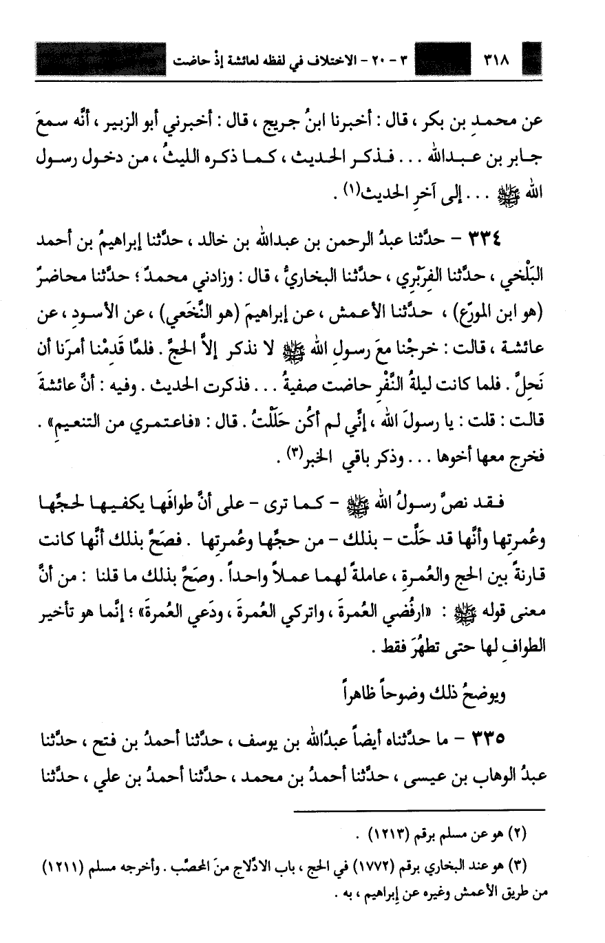 حَدَّثَنَا عَبْدُ الرَّحْمَنِ بْنُ عَبْدِ اللَّهِ بْنِ خَالِدٍ، حَدَّثَنَا إِبْرَاهِيمُ بْنُ أَحْمَدَ الْبَلْخِيُّ، حَدَّثَنَا الْفَرَبْرِيُّ، حَدَّثَنَا الْبُخَارِيُّ، قَالَ: وَزَادَنِي مُحَمَّدٌ: حَدَّثَنَا مُحَاضِرٌ هُوَ ابْنُ الْمُوَرِّعِ، حَدَّثَنَا الْأَعْمَشُ، عَنْ إِبْرَاهِيمَ هُوَ النَّخَعِيُّ، عَنِ الْأَسْوَدِ، عَنْ عَائِشَةَ، قَالَتْ: خَرَجْنَا مَعَ رَسُولِ اللَّهِ صَلَّى اللهُ عَلَيْهِ وَسَلَّمَ لَا نَذْكُرُ إِلَّا الْحَجَّ، فَلَمَّا قَدِمْنَا أَمَرَنَا أَنْ نَحِلَّ، فَلَمَّا كَانَتْ لَيْلَةُ النَّفْرِ حَاضَتْ صَفِيَّةُ، فَذَكَرَتِ الْحَدِيثَ، وَفِيهِ: أَنَّ عَائِشَةَ قَالَتْ: قُلْتُ: يَا رَسُولَ اللَّهِ إِنِّي لَمْ أَكُنْ حَلَلْتُ، قَالَ: «§فَاعْتَمِرِي مِنَ التَّنْعِيمِ» فَخَرَجَ مَعَهَا أَخُوهَا، وَذَكَرَ بَاقِيَ الْخَبَرِ، فَقَدْ نَصَّ رَسُولُ اللَّهِ صَلَّى اللهُ عَلَيْهِ وَسَلَّمَ كَمَا تَرَى عَلَى أَنَّ طَوَافَهَا يَكْفِيهَا لِحَجِّهَا وَعُمْرَتِهَا، وَأَنَّهَا قَدْ حَلَّتْ بِذَلِكَ مِنْ حَجِّهَا وَعُمْرَتِهَا. فَصَحَّ بِذَلِكَ أَنَّهَا كَانَتْ قَارِنَةً بَيْنَ الْحَجِّ وَالْعُمْرَةِ، عَامِلَةً لَهُمَا عَمَلًا وَاحِدًا، وَصَحَّ بِذَلِكَ مَا قُلْنَا: مِنْ أَنَّ مَعْنَى قَوْلِهِ صَلَّى اللهُ عَلَيْهِ وَسَلَّمَ: «ارْفُضِي الْعُمْرَةَ، وَاتْرُكِي الْعُمْرَةَ، وَدَعِي الْعُمْرَةَ» ، إِنَّمَا هُوَ تَأْخِيرُ الطَّوَافِ لَهَا حَتَّى تَطْهُرَ فَقَطْ وَيُوَضِّحُ ذَلِكَ وُضُوحًا ظَاهِرًا: