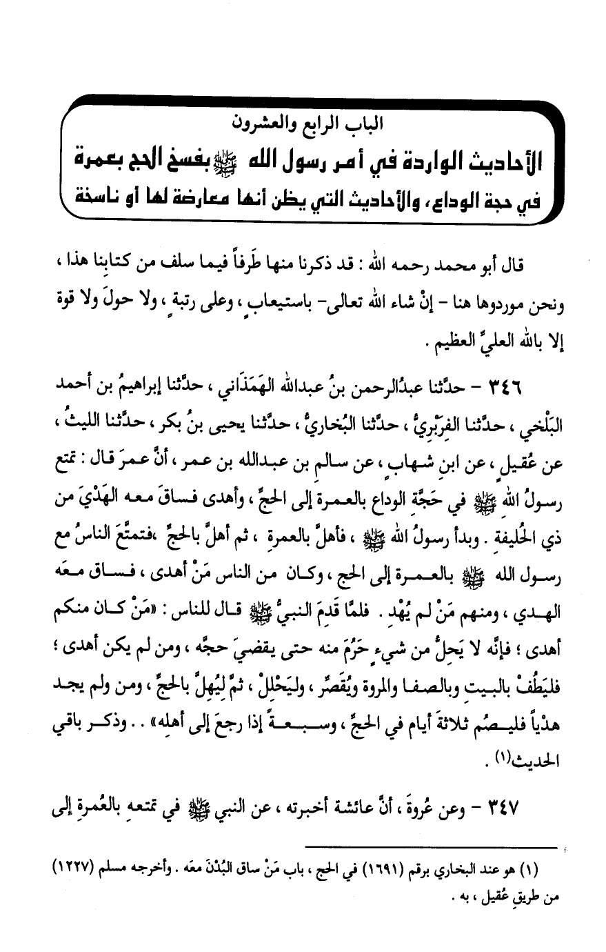 §الْبَابُ الرَّابِعُ وَالْعِشْرُونَ: الْأَحَادِيثُ الْوَارِدَةُ فِي أَمْرِ رَسُولِ اللَّهِ صَلَّى اللهُ عَلَيْهِ وَسَلَّمَ بِفَسْخِ الْحَجِّ بِعُمْرَةٍ فِي حَجَّةِ الْوَدَاعِ، وَالْأَحَادِيثُ الَّتِي يُظَنُّ أَنَّهَا مُعَارِضَةٌ لَهَا أَوْ نَاسِخَةٌ قَالَ أَبُو مُحَمَّدٍ رَحِمَهُ اللَّهُ: قَدْ ذَكَرْنَا مِنْهَا طَرَفًا فِيمَا سَلَفَ مِنْ كِتَابِنَا هَذَا، وَنَحْنُ مُورِدُوهَا هُنَا إِنْ شَاءَ اللَّهُ تَعَالَى بِاسْتِيعَابٍ، وَعَلَى رُتْبَةٍ، وَلَا حَوْلَ وَلَا قُوَّةَ إِلَّا بِاللَّهِ الْعَلِيِّ الْعَظِيمِ.