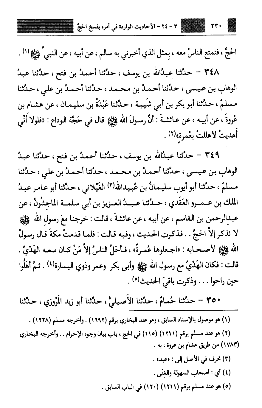 حَدَّثَنَا عَبْدُ اللَّهِ بْنُ يُوسُفَ، حَدَّثَنَا أَحْمَدُ بْنُ فَتْحٍ، حَدَّثَنَا عَبْدُ الْوَهَّابِ بْنُ عِيسَى، حَدَّثَنَا أَحْمَدُ بْنُ مُحَمَّدٍ، حَدَّثَنَا أَحْمَدُ بْنُ عَلِيٍّ، حَدَّثَنَا مُسْلِمٌ، حَدَّثَنَا أَبُو بَكْرِ بْنُ أَبِي شَيْبَةَ، حَدَّثَنَا عَبْدَةُ بْنُ سُلَيْمَانَ، عَنْ هِشَامِ بْنِ عُرْوَةَ، عَنْ أَبِيهِ، عَنْ عَائِشَةَ، أَنَّ رَسُولَ اللَّهِ صَلَّى اللهُ عَلَيْهِ وَسَلَّمَ قَالَ فِي حَجَّةِ الْوَدَاعِ: §«فَلَوْلَا أَنِّي أَهْدَيْتُ لَأَهْلَلْتُ بِعُمْرَةٍ»