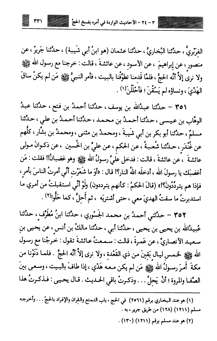 351 - حَدَّثَنَا عَبْدُ اللَّهِ بْنُ يُوسُفَ، حَدَّثَنَا أَحْمَدُ بْنُ فَتْحٍ، حَدَّثَنَا عَبْدُ الْوَهَّابِ بْنُ عِيسَى، حَدَّثَنَا أَحْمَدُ بْنُ مُحَمَّدٍ، حَدَّثَنَا أَحْمَدُ بْنُ عَلِيٍّ، حَدَّثَنَا مُسْلِمٌ، حَدَّثَنَا أَبُو بَكْرِ بْنُ أَبِي شَيْبَةَ، وَمُحَمَّدُ بْنُ مُثَنَّى، وَمُحَمَّدُ بْنُ بَشَّارٍ، كُلُّهُمْ عَنْ غُنْدَرٍ، حَدَّثَنَا شُعْبَةُ، عَنِ الْحَكَمِ، عَنْ عَلِيِّ بْنِ الْحُسَيْنِ، عَنْ ذَكْوَانَ، مَوْلَى عَائِشَةَ، عَنْ عَائِشَةَ، قَالَتْ: فَدَخَلَ عَلَيَّ رَسُولُ اللَّهِ صَلَّى اللهُ عَلَيْهِ وَسَلَّمَ وَهُوَ غَضْبَانُ فَقُلْتُ: مَنْ أَغْضَبَكَ يَا رَسُولَ اللَّهِ؟ أَدْخَلَهُ اللَّهُ النَّارَ، قَالَ: §«أَوَمَا شَعَرْتِ أَنِّي أَمَرْتُ النَّاسَ بِأَمْرٍ فَإِذَا هُمْ يَتَرَدَّدُونَ - قَالَ الْحَكَمُ - كَأَنَّهُمْ يَتَرَدَّدُونَ - وَلَوْ أَنِّي اسْتَقْبَلْتُ مِنْ أَمْرِي مَا اسْتَدْبَرْتُ مَا سُقْتُ الْهَدْيَ مَعِي حَتَّى أَشْتَرِيَهُ ثُمَّ أَحِلُّ كَمَا حَلُّوا»