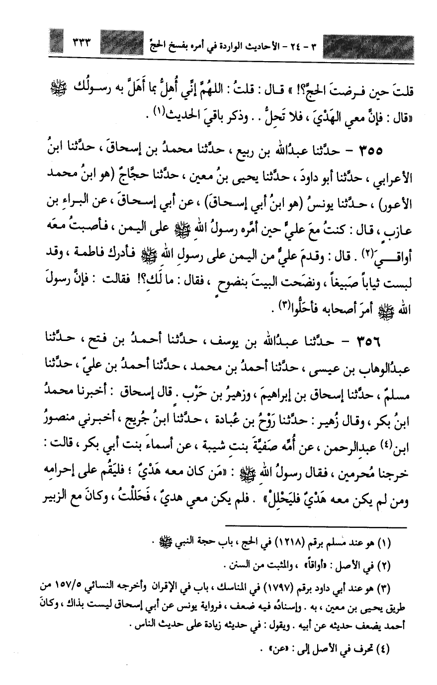 356 - حَدَّثَنَا عَبْدُ اللَّهِ بْنُ يُوسُفَ، حَدَّثَنَا أَحْمَدُ بْنُ فَتْحٍ، حَدَّثَنَا عَبْدُ الْوَهَّابِ بْنُ عِيسَى، حَدَّثَنَا أَحْمَدُ بْنُ مُحَمَّدٍ، حَدَّثَنَا أَحْمَدُ بْنُ عَلِيٍّ، حَدَّثَنَا مُسْلِمٌ، حَدَّثَنَا إِسْحَاقُ بْنُ إِبْرَاهِيمَ، وَزُهَيْرُ بْنُ حَرْبٍ، قَالَ إِسْحَاقُ: أَخْبَرَنَا مُحَمَّدُ بْنُ بَكْرٍ، وَقَالَ زُهَيْرٌ: حَدَّثَنَا رَوْحُ بْنُ عُبَادَةَ، حَدَّثَنَا ابْنُ جُرَيْجٍ، أَخْبَرَنِي مَنْصُورُ بْنُ عَبْدِ الرَّحْمَنِ، عَنْ أُمِّهِ صَفِيَّةَ بِنْتِ شَيْبَةَ، عَنْ أَسْمَاءَ بِنْتِ أَبِي بَكْرٍ، قَالَتْ: خَرَجْنَا مُحْرِمِينَ فَقَالَ رَسُولُ اللَّهِ صَلَّى اللهُ عَلَيْهِ وَسَلَّمَ: §«مَنْ كَانَ مَعَهُ هَدْيٌ فَلْيَقُمْ عَلَى إِحْرَامِهِ، وَمَنْ لَمْ يَكُنْ مَعَهُ هَدْيٌ فَلْيَحْلِلْ» ، فَلَمْ يَكُنْ مَعِي هَدْيٌ فَحَلَلْتُ، وَكَانَ مَعَ الزُّبَيْرِ -[334]- هَدْيٌ فَلَمْ يَحِلَّ.