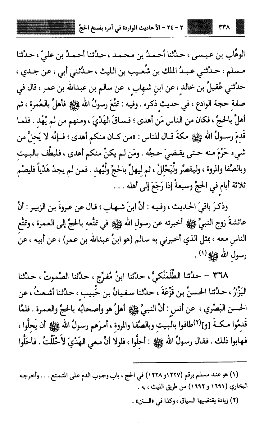 368 - حَدَّثَنَا الطَّلَمَنْكِيُّ، حَدَّثَنَا ابْنُ مُفَرِّجٍ، حَدَّثَنَا الصَّمُوتُ، حَدَّثَنَا الْبَزَّارُ، حَدَّثَنَا الْحَسَنُ بْنُ قَزَعَةَ، حَدَّثَنَا سُفْيَانُ بْنُ حَبِيبٍ، حَدَّثَنَا أَشْعَثُ، عَنِ الْحَسَنِ الْبَصْرِيِّ، عَنْ أَنَسٍ، أَنَّ النَّبِيَّ صَلَّى اللهُ عَلَيْهِ وَسَلَّمَ أَهَلَّ هُوَ وَأَصْحَابُهُ بِالْحَجِّ وَالْعُمْرَةِ، فَلَمَّا قَدِمُوا مَكَّةَ، وَطَافُوا بِالْبَيْتِ وَبِالصَّفَا وَالْمَرْوَةِ، أَمَرَهُمْ رَسُولُ اللَّهِ صَلَّى اللهُ عَلَيْهِ وَسَلَّمَ أَنْ يَحِلُّوا فَهَابُوا ذَلِكَ، فَقَالَ رَسُولُ اللَّهِ صَلَّى اللهُ عَلَيْهِ وَسَلَّمَ: «§أَحِلُّوا فَلَوْلَا أَنَّ مَعِيَ الْهَدْيَ لَأَحْلَلْتُ» ، فَأَحَلُّوا -[339]- حَتَّى حَلُّوا إِلَى النِّسَاءِ