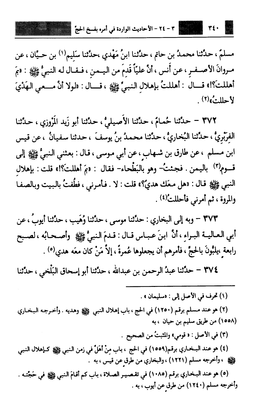 373 - وَبِهِ إِلَى الْبُخَارِيِّ: حَدَّثَنَا مُوسَى، حَدَّثَنَا وُهَيْبٌ، حَدَّثَنَا أَيُّوبُ، عَنْ أَبِي الْعَالِيَةِ الْبَرَاءِ، أَنَّ ابْنَ عَبَّاسٍ، قَالَ: قَدِمَ النَّبِيُّ صَلَّى اللهُ عَلَيْهِ وَسَلَّمَ وَأَصْحَابُهُ لِصُبْحِ رَابِعَةٍ يُلَبُّونَ بِالْحَجِّ، §فَأَمَرَهُمْ أَنْ يَجْعَلُوهَا عُمْرَةً إِلَّا مَنْ كَانَ مَعَهُ هَدْيٌ