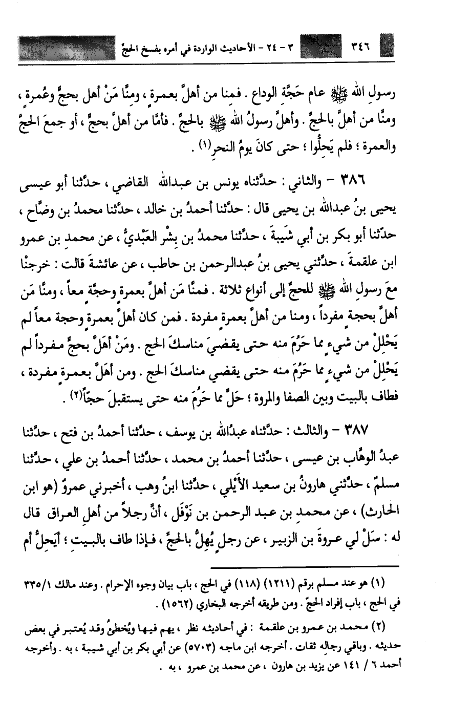 386 - وَالثَّانِي: حَدَّثَنَاهُ يُونُسُ بْنُ عَبْدِ اللَّهِ الْقَاضِي، حَدَّثَنَا أَبُو عِيسَى يَحْيَى بْنُ عَبْدِ اللَّهِ بْنِ يَحْيَى، قَالَ: حَدَّثَنَا أَحْمَدُ بْنُ خَالِدٍ، حَدَّثَنَا مُحَمَّدُ بْنُ وَضَّاحٍ، حَدَّثَنَا أَبُو بَكْرِ بْنُ أَبِي شَيْبَةَ، حَدَّثَنَا مُحَمَّدُ بْنُ بِشْرٍ الْعَبْدِيُّ، عَنْ مُحَمَّدِ بْنِ عَمْرِو بْنِ عَلْقَمَةَ، حَدَّثَنِي يَحْيَى بْنُ عَبْدِ الرَّحْمَنِ بْنِ حَاطِبٍ، عَنْ عَائِشَةَ، قَالَتْ: §خَرَجْنَا مَعَ رَسُولِ اللَّهِ صَلَّى اللهُ عَلَيْهِ وَسَلَّمَ لِلْحَجِّ إِلَى أَنْوَاعٍ ثَلَاثَةٍ، فَمِنَّا مَنْ أَهَلَّ بِعُمْرَةٍ وَحَجَّةٍ مَعًا، وَمِنَّا مَنْ أَهَلَّ بِحَجَّةٍ مُفْرِدًا، وَمِنَّا منْ أَهَلَّ بِعُمْرَةٍ مُفْرَدَةٍ، فَمَنْ كَانَ أَهَلَّ بِعُمْرَةٍ وَحَجَّةٍ مَعًا لَمْ يَحْلِلْ مِنْ شَيْءٍ مِمَّا حَرُمَ مِنْهُ حَتَّى يَقْضِيَ مَنَاسِكَ الْحَجِّ، وَمَنْ أَهَلَّ بِحَجٍّ مُفْرِدًا لَمْ يَحْلِلْ مِنْ شَيْءٍ مِمَّا حَرُمَ مِنْهُ حَتَّى يَقْضِيَ مَنَاسِكَ الْحَجِّ، وَمَنْ أَهَلَّ بِعُمْرَةٍ مُفْرَدَةٍ فَطَافَ بِالْبَيْتِ وَبَيْنَ الصَّفَا وَالْمَرْوَةِ حَلَّ مِمَّا حَرُمَ مِنْهُ حَتَّى يَسْتَقْبِلَ حَجًّا
