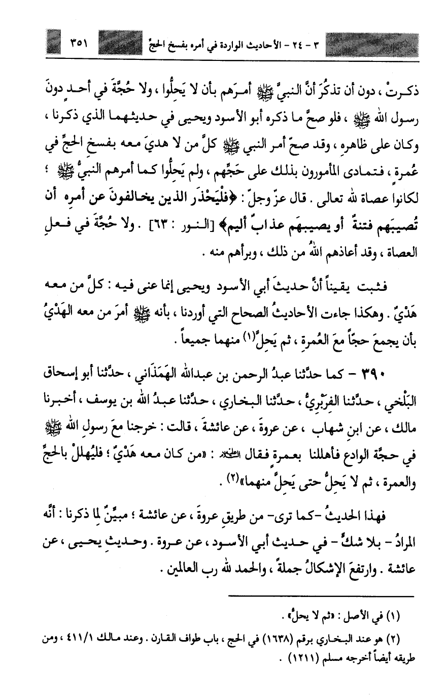 390 - كَمَا حَدَّثَنَا عَبْدُ الرَّحْمَنِ بْنُ عَبْدِ اللَّهِ الْهَمَذَانِيُّ، حَدَّثَنَا أَبُو إِسْحَاقَ الْبَلْخِيُّ، حَدَّثَنَا الْفَرَبْرِيُّ، حَدَّثَنَا الْبُخَارِيُّ، حَدَّثَنَا عَبْدُ اللَّهِ بْنُ يُوسُفَ، أَخْبَرَنَا مَالِكٌ، عَنِ ابْنِ شِهَابٍ، عَنْ عُرْوَةَ، عَنْ عَائِشَةَ، قَالَتْ: خَرَجْنَا مَعَ رَسُولِ اللَّهِ صَلَّى اللهُ عَلَيْهِ وَسَلَّمَ فِي حَجَّةِ الْوَدَاعِ، فَأَهْلَلْنَا بِعُمْرَةٍ، فَقَالَ عَلَيْهِ السَّلَامُ: «§مَنْ كَانَ مَعَهُ هَدْيٌ فَلْيُهْلِلْ بِالْحَجِّ وَالْعُمْرَةِ، ثُمَّ لَا يَحِلُّ حَتَّى يَحِلَّ مِنْهُمَا» ، فَهَذَا الْحَدِيثُ كَمَا تَرَى مِنْ طَرِيقِ عُرْوَةَ، عَنْ عَائِشَةَ مُبَيِّنٌ لِمَا ذَكَرْنَا أَنَّهُ الْمُرَادُ بِلَا شَكٍّ، فِي حَدِيثِ أَبِي الْأَسْوَدِ، عَنْ عُرْوَةَ وَحَدِيثِ يَحْيَى، عَنْ عَائِشَةَ، وَارْتَفَعَ الْإِشْكَالُ جُمْلَةً، وَالْحَمْدُ لِلَّهِ رَبِّ الْعَالَمِينَ -[352]-. وَمِمَّا يُبَيِّنُ أَنَّ فِيَ حَدِيثِ أَبِي الْأَسْوَدِ حَذْفًا قَوْلُهُ فِيهِ عَنْ عُرْوَةَ: إِنَّ أُمَّهُ وَخَالَتَهُ وَالزُّبَيْرَ أَقْبَلُوا بِعُمْرَةٍ فَقَطْ، فَلَمَّا مَسَحُوا الرُّكْنَ حَلُّوا، قَالَ أَبُو مُحَمَّدٍ رَحِمَهُ اللَّهُ: وَلَا خِلَافَ بَيْنَ أَحَدٍ فِي أَنَّ مَنْ أَقْبَلَ بِعُمْرَةٍ لَا يَحِلُّ أَنْ يَمْسَحَ الرُّكْنَ إِلَّا حَتَّى يَسْعَى بَيْنَ الصَّفَا وَالْمَرْوَةِ بَعْدَ مَسْحِ الرُّكْنِ، فَصَحَّ أَنَّ فِيَ حَدِيثِهِ حَذْفًا تُبَيِّنُهُ سَائِرُ الْأَحَادِيثِ الصِّحَاحِ الَّتِي ذَكَرْنَا وَبَطَلَ الشَّغَبُ بِهِ جُمْلَةً، وَبِاللَّهِ تَعَالَى التَّوْفِيقُ، وَأَمَّا قَوْلُ أَبِي الْأَسْوَدِ عَنْ عُرْوَةَ فِي حَدِيثِهِ: إِنَّهُ كَذَبَ مَنْ أَخْبَرَ أَنَّ رَسُولَ اللَّهِ صَلَّى اللهُ عَلَيْهِ وَسَلَّمَ فَعَلَ ذَلِكَ، يَعْنِي: فَسْخَ الْحَجِّ بِعُمْرَةٍ فَقَدْ صَدَقَ عُرْوَةُ، وَقَدْ ذَكَرْنَا فِيمَا أَوْرَدْنَاهُ مِنَ الْأَحَادِيثِ الْمُتَوَاتِرَةِ الصِّحَاحِ أَنَّهُ صَلَّى اللهُ عَلَيْهِ وَسَلَّمَ أَخْبَرَهُمْ أَنَّ الَّذِيَ مَنَعَهُ عَلَيْهِ السَّلَامُ أَنْ يَحِلَّ بِعُمْرَةٍ كَمَا أَمَرَهُمْ كَوْنُ الْهَدْيِ مَعَهُ، وَأَنَّهُ عَلَيْهِ السَّلَامُ، قَالَ: لَوِ اسْتَقْبَلْتُ مِنْ أَمْرِي مَا اسْتَدْبَرْتُ مَا سُقْتُ الْهَدْيَ، وَلَوْلَا الْهَدْيُ لَأَحْلَلْتُ، لَكِنَّهُ عَلَيْهِ السَّلَامُ أَمَرَ كُلَّ مَنْ لَمْ يَسُقْ هَدْيًا مَعَ نَفْسِهِ بِفَسْخِ حَجِّهِ فِي عُمْرَةٍ يَحِلُّ مِنْهَا، ثُمَّ يُهِلُّ بِالْحَجِّ يَوْمَ التَّرْوِيَةِ عَلَى مَا قَدْ ذَكَرْنَا فِي مَا خَلَا مِنْ كِتَابِنَا هَذَا، وَأَمَّا حَدِيثُ أَبِي الْأَسْوَدِ عَنْ عُرْوَةَ مِنْ فِعْلِ أَبِي بَكْرٍ، وَعُمَرَ، وَعُثْمَانَ، وَمُعَاوِيَةَ وَالْمُهَاجِرِينَ وَالْأَنْصَارِ وَابْنِ عُمَرَ، فَلَا حُجَّةَ فِي أَحَدٍ دُونَ رَسُولِ اللَّهِ صَلَّى اللهُ عَلَيْهِ وَسَلَّمَ، وَقَدْ أَجَابَ ابْنُ عَبَّاسٍ رَضِيَ اللَّهُ عَنْهُ فِي هَذِهِ الْمَسْأَلَةِ عُرْوَةَ فَأَحْسَنَ جَوَابَهُ