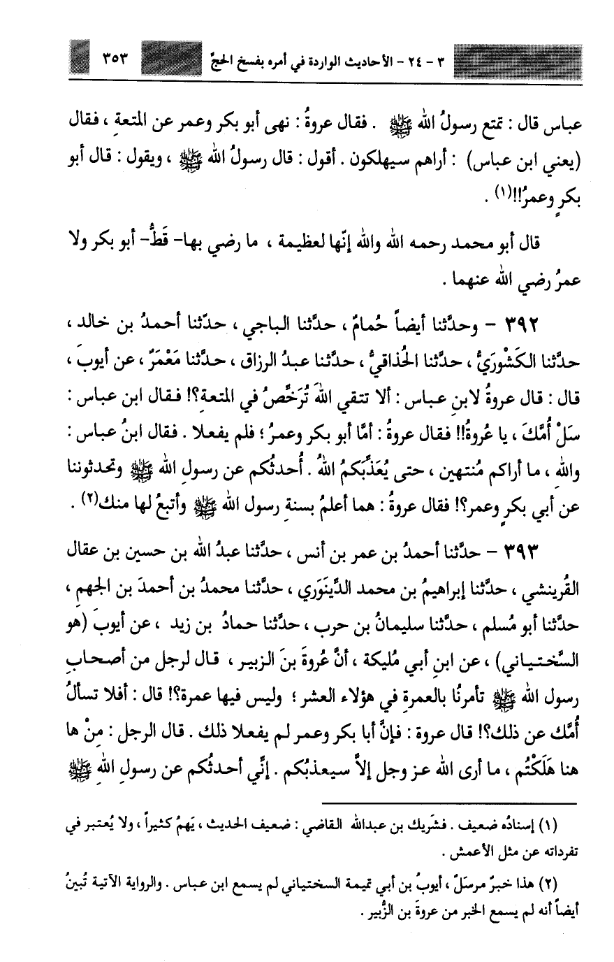 393 - حَدَّثَنَا أَحْمَدُ بْنُ عُمَرَ بْنِ أَنَسٍ، حَدَّثَنَا عَبْدُ اللَّهِ بْنُ حُسَيْنِ بْنِ عِقَالٍ الْقُرَيْنَشِيُّ، حَدَّثَنَا إِبْرَاهِيمُ بْنُ مُحَمَّدٍ الدَّيْنَوَرِيُّ، حَدَّثَنَا مُحَمَّدُ بْنُ أَحْمَدَ بْنِ الْجَهْمِ، حَدَّثَنَا أَبُو مُسْلِمٍ، حَدَّثَنَا سُلَيْمَانُ بْنُ حَرْبٍ، حَدَّثَنَا حَمَّادُ بْنُ زَيْدٍ، عَنْ أَيُّوبَ هُوَ السِّخْتِيَانِيُّ، عَنِ ابْنِ أَبِي مُلَيْكَةَ، أَنَّ عُرْوَةَ بْنَ الزُّبَيْرِ، قَالَ لِرَجُلٍ مِنْ أَصْحَابِ رَسُولِ اللَّهِ صَلَّى اللهُ عَلَيْهِ وَسَلَّمَ: تَأْمُرُنَا بِالْعُمْرَةِ فِي هَؤُلَاءِ الْعَشْرِ وَلَيْسَ فِيهَا عُمْرَةٌ؟ قَالَ: أَفَلَا تَسْأَلُ أُمَّكَ عَنْ ذَلِكَ؟ قَالَ عُرْوَةُ: فَإِنَّ أَبَا بَكْرٍ، وَعُمَرَ لَمْ يَفْعَلَا ذَلِكَ، قَالَ الرَّجُلُ: مِنْ هَا هُنَا هَلَكْتُمْ، §مَا أَرَى اللَّهَ عَزَّ وَجَلَّ إِلَّا سَيُعَذِّبُكُمْ، إِنِّي أُحَدِّثُكُمْ عَنْ رَسُولِ اللَّهِ صَلَّى اللهُ عَلَيْهِ وَسَلَّمَ -[354]- وَتُخْبِرُونَنِي بِأَبِي بَكْرٍ، وَعُمَرَ، فَقَالَ عُرْوَةُ: إِنَّهُمَا وَاللَّهِ كَانَا أَعْلَمَ بِسُنَّةِ رَسُولِ اللَّهِ صَلَّى اللهُ عَلَيْهِ وَسَلَّمَ، وَأَتْبَعَ لَهَا مِنْكَ، فَسَكَتَ الرَّجُلُ، هُنَا انْتَهَى الْحَدِيثُ. قَالَ أَبُو مُحَمَّدٍ رَحِمَهُ اللَّهُ: وَنَحْنُ نَقُولُ لِعُرْوَةَ: ابْنُ عَبَّاسٍ أَعْلَمُ بِسُنَّةِ رَسُولِ اللَّهِ صَلَّى اللهُ عَلَيْهِ وَسَلَّمَ وَبِأَبِي بَكْرٍ وَبِعُمَرَ مِنْكَ، وَأَوْلَى بِهِمْ ثَلَاثَتِهِمْ مِنْكَ، لَا يَشُكُّ فِي ذَلِكَ مُسْلِمٌ، وَعَائِشَةُ أُمُّ الْمُؤْمِنِينَ أَعْلَمُ وَأَصْدَقُ مِنْ عُرْوَةَ