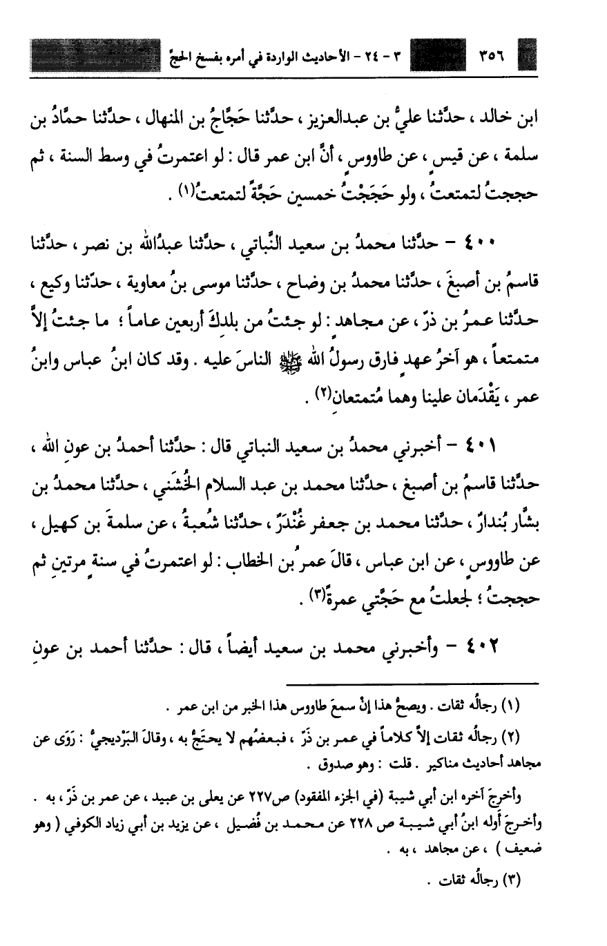 402 - وَأَخْبَرَنِي مُحَمَّدُ بْنُ سَعِيدٍ، أَيْضًا، قَالَ: حَدَّثَنَا أَحْمَدُ بْنُ عَوْنِ -[357]- اللَّهِ، حَدَّثَنَا قَاسِمُ بْنُ أَصْبَغَ، حَدَّثَنَا مُحَمَّدُ بْنُ عَبْدِ السَّلَامِ الْخُشَنِيُّ، حَدَّثَنَا مُحَمَّدُ بْنُ الْمُثَنَّى، حَدَّثَنَا عَبْدُ الرَّحْمَنِ بْنُ مَهْدِيٍّ، حَدَّثَنَا سُفْيَانُ الثَّوْرِيُّ، عَنْ سَلَمَةَ بْنِ كُهَيْلٍ، عَنْ طَاوُسٍ، عَنِ ابْنِ عَبَّاسٍ، قَالَ: سَمِعْتُ عُمَرَ بْنَ الْخَطَّابِ، يَقُولُ: §لَوِ اعْتَمَرْتُ ثُمَّ حَجَجْتُ لَتَمَتَّعْتُ