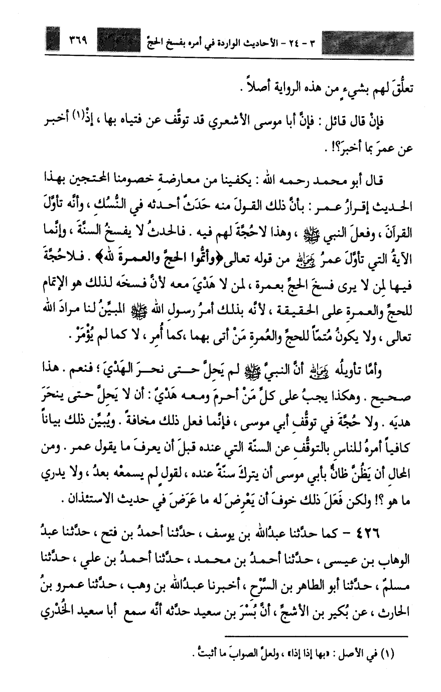 426 - كَمَا حَدَّثَنَا عَبْدُ اللَّهِ بْنُ يُوسُفَ، حَدَّثَنَا أَحْمَدُ بْنُ فَتْحٍ، حَدَّثَنَا عَبْدُ الْوَهَّابِ بْنُ عِيسَى، حَدَّثَنَا أَحْمَدُ بْنُ مُحَمَّدٍ، حَدَّثَنَا أَحْمَدُ بْنُ عَلِيٍّ، حَدَّثَنَا مُسْلِمٌ، حَدَّثَنَا أَبُو الطَّاهِرِ بْنُ السَّرْحِ، أَخْبَرَنَا عَبْدُ اللَّهِ بْنُ وَهْبٍ، حَدَّثَنَا عَمْرُو بْنُ الْحَارِثِ، عَنْ بُكَيْرِ بْنِ الْأَشَجِّ، أَنَّ بُسْرَ بْنَ سَعِيدٍ، حَدَّثَهُ أَنَّهُ، سَمِعَ أَبَا سَعِيدٍ الْخُدْرِيَّ -[370]-، قَالَ: كُنَّا فِي مَجْلِسٍ عِنْدَ أُبَيِّ بْنِ كَعْبٍ، فَأَتَى أَبُو مُوسَى الْأَشْعَرِيُّ مُغْضَبًا حَتَّى وَقَفَ، فَقَالَ أَنْشُدُكُمُ اللَّهَ، هَلْ سَمِعَ أَحَدٌ مِنْكُمْ رَسُولَ اللَّهِ صَلَّى اللهُ عَلَيْهِ وَسَلَّمَ يَقُولُ: «§الِاسْتِئْذَانُ ثَلَاثٌ، فَإِنْ أُذِنَ لَكَ، وَإِلَّا فَارْجِعْ» ، قَالَ أُبَيٌّ: وَمَا ذَاكَ؟، قَالَ: اسْتَأْذَنْتُ عَلَى عُمَرَ بْنِ الْخَطَّابِ ثَلَاثَ مَرَّاتٍ فَلَمْ يُؤْذَنْ لِي، فَرَجَعْتُ، ثُمَّ جِئْتُهُ الْيَوْمَ فَدَخَلْتُ عَلَيْهِ، فَأَخْبَرْتُهُ أَنِّي جِئْتُ أَمْسِ، فَسَلَّمْتُ ثَلَاثًا، ثُمَّ انْصَرَفْتُ، فَقَالَ: قَدْ سَمِعْنَاكَ وَنَحْنُ عَلَى شُغُلَ، فَلَوْ مَا اسْتَأْذَنْتَ حَتَّى يُؤْذَنَ لَكَ؟ قَالَ: اسْتَأْذَنْتُ كَمَا سَمِعْتُ رَسُولَ اللَّهِ صَلَّى اللهُ عَلَيْهِ وَسَلَّمَ، قَالَ: فَوَاللَّهِ لَأُوجِعَنَّ ظَهْرَكَ وَبَطْنَكَ أَوْ لَتَأْتِيَنِّي بِمَنْ يَشْهَدُ لَكَ عَلَى هَذَا، فَقَالَ أُبَيُّ بْنُ كَعْبٍ: فَوَاللَّهِ لَا يَقُومُ مَعَكَ إِلَّا أَحْدَثُنَا سِنًّا، قُمْ يَا أَبَا سَعِيدٍ، فَقُمْتُ حَتَّى أَتَيْتُ عُمَرَ، فَقُلْتُ: سَمِعْتُ رَسُولَ اللَّهِ صَلَّى اللهُ عَلَيْهِ وَسَلَّمَ يَقُولُ هَذَا. قَالَ أَبُو مُحَمَّدٍ رَحِمَهُ اللَّهُ: كَانَتْ فِي عُمَرَ رَضِيَ اللَّهُ عَنْهُ شِدَّةٌ إِذَا سَمِعَ الشَّيْءَ الَّذِي لَا يَعْرِفُهُ وَلَمْ يَبْلُغْهُ قَصْدًا بِذَلِكَ إِلَى الْخَيْرِ، وَكَانَ سَرِيعَ الْفَيْئَةِ إِلَى الْحَقِّ إِذَا بَلَغَهُ رَضِيَ اللَّهُ عَنْهُ، وَيُبَيِّنُ صِحَّةَ مَا قُلْنَا، وَأَنَّ تَوَقُّفَ أَبِي مُوسَى رَحِمَهُ اللَّهُ عَنِ الْفُتْيَا بِالْفَسْخِ لَمْ يَكُنْ رُجُوعًا مِنْهُ عَنِ الْقَوْلِ بِهِ، وَلَا شَكًّا مِنْهُ فِي صِحَّةِ الْحُكْمِ بِهِ، لَكِنْ تَوَقُّعُ مَا قُلْنَاهُ: أَنَّ أَبَا مُوسَى قَدْ كَلَّمَ عُمَرَ هُوَ وَأُبَيُّ بْنُ كَعْبٍ فِي أَمْرِ الْمُتْعَةِ، وَنَازَلَاهُ فِيهَا، حَتَّى اعْتَرَفَ لَهُمَا بِرُجُوعِهِ عَنْ إِنْكَارِهَا إِلَى الْعَمَلِ بِهَا، وَقَدْ ذَكَرْنَا هَذَا الْحَدِيثَ قَبْلُ مِنْ طَرِيقِ الْكَشْوَرِيِّ عَنِ الْحُذَاقِيِّ، عَنْ عَبْدِ الرَّزَّاقِ، عَنْ مَعْمَرٍ، عَنِ ابْنِ -[371]- طَاوُسٍ، عَنْ أَبِيهِ، وَهَذَا هُوَ الَّذِي يَلِيقُ بِعُمَرَ رَضِيَ اللَّهُ عَنْهُ