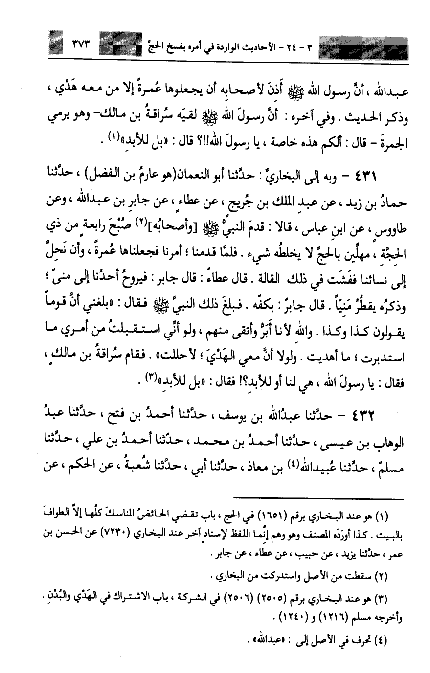 431 - وَبِهِ إِلَى الْبُخَارِيِّ، حَدَّثَنَا أَبُو النُّعْمَانِ، هُوَ عَارِمُ بْنُ الْفَضْلِ، حَدَّثَنَا حَمَّادُ بْنُ زَيْدٍ، عَنْ عَبْدِ الْمَلِكِ بْنِ جُرَيْجٍ، عَنْ عَطَاءٍ، عَنْ جَابِرِ بْنِ عَبْدِ اللَّهِ، وَعَنْ طَاوُسٍ، عَنِ ابْنِ عَبَّاسٍ، قَالَا: §قَدِمَ النَّبِيُّ صَلَّى اللهُ عَلَيْهِ وَسَلَّمَ وَأَصْحَابُهُ صُبْحَ رَابِعَةٍ مِنْ ذِي الْحِجَّةِ مُهِلِّينَ بِالْحَجِّ، لَا يَخْلِطُهُ شَيْءٌ، فَلَمَّا قَدِمْنَا أَمَرَنَا فَجَعَلْنَاهَا عُمْرَةً وَأَنْ نَحِلَّ إِلَى نِسَائِنَا، فَفَشَتْ فِي ذَلِكَ الْقَالَةُ، قَالَ عَطَاءٌ: قَالَ جَابِرٌ: فَيَرُوحُ أَحَدُنَا إِلَى مِنًى وَذَكَرُهُ يَقْطُرُ مَنِيًّا، قَالَ جَابِرٌ: بِكَفِّهِ، فَبَلَغَ ذَلِكَ النَّبِيَّ صَلَّى اللهُ عَلَيْهِ وَسَلَّمَ، فَقَالَ: «بَلَغَنِي أَنَّ قَوْمًا يَقُولُونَ كَذَا وَكَذَا، وَاللَّهِ لَأَنَا أَبَرُّ وَأَتْقَى مِنْهُمْ، وَلَوْ أَنِّي اسْتَقْبَلْتُ مِنْ أَمْرِي مَا اسْتَدْبَرْتُ مَا أَهْدَيْتُ، وَلَوْلَا أَنَّ مَعِيَ الْهَدْيَ لَأَحْلَلْتُ» ، فَقَامَ سُرَاقَةُ بْنُ مَالِكٍ فَقَالَ: يَا رَسُولَ اللَّهِ، هِيَ لَنَا أَوْ لِلْأَبَدِ؟ فَقَالَ: «بَلْ لِلْأَبَدِ»