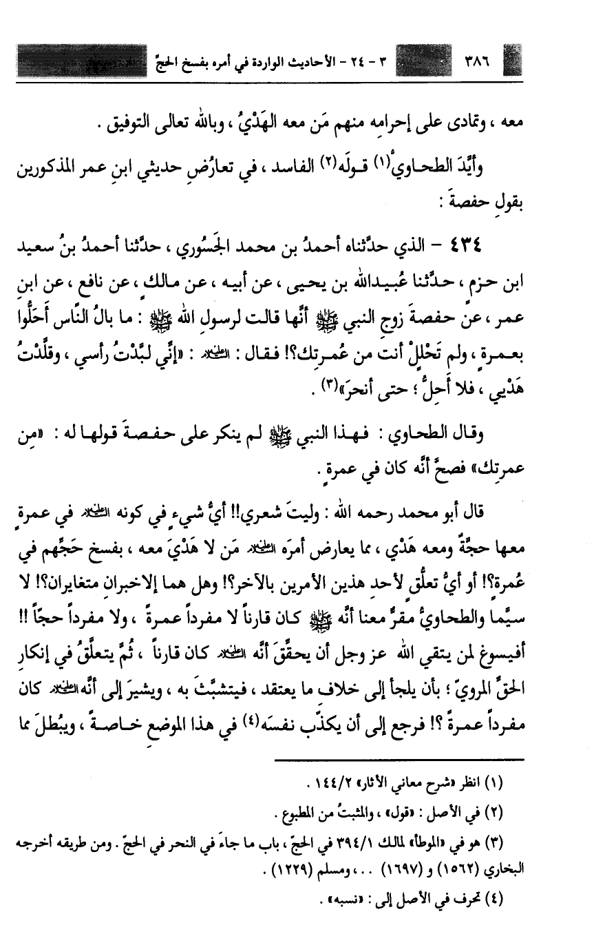 434 - الَّذِي حَدَّثَنَاهُ أَحْمَدُ بْنُ مُحَمَّدٍ الْجَسُورِيُّ، حَدَّثَنَا أَحْمَدُ بْنُ سَعِيدِ بْنِ حَزْمٍ، حَدَّثَنَا عُبَيْدُ اللَّهِ بْنُ يَحْيَى، عَنْ أَبِيهِ، عَنْ مَالِكٍ، عَنْ نَافِعٍ، عَنِ ابْنِ عُمَرَ، عَنْ حَفْصَةَ، زَوْجِ النَّبِيِّ صَلَّى اللهُ عَلَيْهِ وَسَلَّمَ أَنَّهَا قَالَتْ لِرَسُولِ اللَّهِ صَلَّى اللهُ عَلَيْهِ وَسَلَّمَ: §مَا بَالُ النَّاسِ أَحَلُّوا بِعُمْرَةٍ، وَلَمْ تَحْلِلْ أَنْتَ مِنْ عُمْرَتِكَ؟ فَقَالَ عَلَيْهِ السَّلَامُ: «إِنِّي لَبَّدْتُ رَأْسِي وَقَلَّدْتُ هَدْيِي فَلَا أَحِلُّ حَتَّى أَنْحَرَ» . وَقَالَ الطَّحَاوِيُّ: فَهَذَا النَّبِيُّ صَلَّى اللهُ عَلَيْهِ وَسَلَّمَ لَمْ يُنْكِرْ عَلَى حَفْصَةَ قَوْلَهَا لَهُ: «مِنْ عُمْرَتِكَ» ، فَصَحَّ أَنَّهُ كَانَ فِي عُمْرَةٍ قَالَ أَبُو مُحَمَّدٍ رَحِمَهُ اللَّهُ: وَلَيْتَ شِعْرِي أَيُّ شَيْءٍ فِي كَوْنِهِ عَلَيْهِ السَّلَامُ فِي عُمْرَةٍ مَعَهَا حَجَّةٌ وَمَعَهُ هَدْيٌ مِمَّا يُعَارِضُ أَمْرَهُ عَلَيْهِ السَّلَامُ مَنْ لَا هَدْيَ مَعَهُ بِفَسْخِ حَجِّهِمْ فِي عُمْرَةٍ؟ أَوْ أَيُّ تَعَلُّقٍ لِأَحَدِ هَذَيْنِ الْأَمْرَيْنِ بِالْآخَرِ؟ وَهَلْ هُمَا إِلَّا خَبَرَانِ مُتَغَايِرَانِ؟ لَا سِيَّمَا وَالطَّحَاوِيُّ مُقِرٌّ مَعَنَا أَنَّهُ صَلَّى اللهُ عَلَيْهِ وَسَلَّمَ كَانَ قَارِنًا لَا مُفْرِدًا عُمْرَةً، وَلَا مُفْرِدًا حَجًّا، أَفَيَسُوغُ لِمَنْ يَتَّقِي اللَّهَ عَزَّ وَجَلَّ أَنْ يُحَقِّقَ أَنَّهُ عَلَيْهِ السَّلَامُ كَانَ قَارِنًا ثُمَّ يَتَعَلَّقُ فِي إِنْكَارِ الْحَقِّ الْمَرْوِيِّ؟ بِأَنْ يَلْجَأَ إِلَى خِلَافِ مَا يَعْتَقِدُ فَيَتَشَبَّثَ بِهِ، وَيُشِيرَ إِلَى أَنَّهُ عَلَيْهِ السَّلَامُ كَانَ مُفْرِدًا عُمْرَةً، فَرَجَعَ إِلَى أَنْ يُكَذِّبَ نَفْسَهُ فِي هَذَا الْمَوْضِعِ خَاصَّةً، وَيُبْطِلَ مِمَّا -[387]- صَحَّحَ قَبْلُ مِنْ مَذْهَبِهِ، فَهُوَ إِذَا نَاظَرَ خُصُومَهُ فِي حَالِ إِهْلَالِ النَّبِيِّ صَلَّى اللهُ عَلَيْهِ وَسَلَّمَ فِي حَجَّةِ الْوَدَاعِ قَالَ: إِنَّهُ عَلَيْهِ السَّلَامُ كَانَ مُلَبِّيًا بِحَجَّةٍ وَعُمْرَةٍ مَعًا قَارِنًا بَيْنَهُمَا، وَلَمْ يَكُنْ مُتَمَتِّعًا، فَإِذَا أَتَى إِلَى الْكَلَامِ فِي الْفَسْخِ قَالَ: كَانَ عَلَيْهِ السَّلَامُ فِي حَجَّةِ الْوَدَاعِ مُلَبِّيًا بِعُمْرَةٍ مُفْرَدَةٍ، مُتَمَتِّعًا بِالْحَجِّ مِنْ عَامِهِ. وَاللَّهِ إِنَّ هَذَا الْأَمْرَ لَا يَسْتَجِيزُهُ ذُو وَرَعٍ يَخَافُ النَّارَ، وَلَا ذُو حَيَاءٍ يَتَجَنَّبُ الْعَارَ، وَلَا عَجَبَ مِنْ أَهْلِ عَصْرِنَا إِذَا كَانَ مَنْ سَلَفَ مِمَّنِ اتَّسَعَ فِي الْمَعْرِفَةِ يَسْتَجِيزُ مِثْلَ هَذَا الْبَلَاءِ؛ نَظَرًا لِتَقْلِيدِهِ الْفَاسِدِ، نَعُوذُ بِاللَّهِ مِنَ الْخُذْلَانِ، وَنَسْأَلُهُ الْعِصْمَةَ آمِينَ. وَإِذَا حَصَلَ لَنَا مِنْ كَلَامِ الطَّحَاوِيِّ أَنَّ الْفَسْخَ الْمَأْمُورَ بِهِ إِنَّمَا كَانَ مِنْ عُمْرَةٍ، وَأَنَّ النَّهْيَ الْوَارِدَ لِمَنْ كَانَ مَعَهُ الْهَدْيُ أَنْ لَا يَحِلَّ حَتَّى يُتِمَّ الْحَجَّ: إِنَّمَا أَمَرَ بِذَلِكَ مَنْ أَهَلَّ بِعُمْرَةٍ فَقَطْ، وَسَاقَ الْهَدْيَ مَعَ نَفْسِهِ، وَنَوَى التَّمَتُّعَ بِالْحَجِّ مِنْ عَامِهِ. وَقَدْ تَيَقَّنَّا كَذِبَ هَذَا الْكَلَامِ بِمَا صَحَّ مِمَّا ذَكَرْنَاهُ قَبْلُ مِنْ دِرَايَةِ مَنْ رَوَى مِنَ الصَّحَابَةِ رَضِيَ اللَّهُ عَنْهُمْ أَنَّهُ كَانَ مِنْهُمْ فِي تِلْكَ الْحَجَّةِ مَنْ قَرَنَ، وَمَنْ أَهَلَّ بِحَجٍّ مُفْرَدٍ، وَمَنْ أَهَلَّ بِعُمْرَةٍ مُفْرَدَةٍ، وَمِنْ رِوَايَةِ مَنْ رَوَى مِنْهُمْ: خَرَجْنَا مُهِلِّينَ بِالْحَجِّ، لَا نَعْرِفُ الْعُمْرَةَ، وَقَدْ ذَكَرْنَا كُلَّ ذَلِكَ بِأَسَانِيدِهِ الصِّحَاحِ، وَبِ