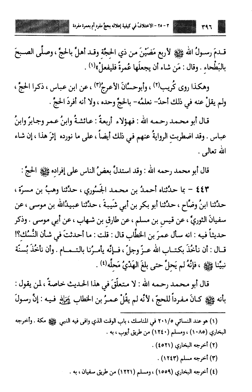 443 - بِمَا حَدَّثَنَاهُ أَحْمَدُ بْنُ مُحَمَّدٍ الْجَسُورِيُّ، حَدَّثَنَا وَهْبُ بْنُ مَسَرَّةَ، حَدَّثَنَا ابْنُ وَضَّاحٍ، حَدَّثَنَا أَبُو بَكْرِ بْنُ أَبِي شَيْبَةَ، حَدَّثَنَا عُبَيْدُ اللَّهِ بْنُ مُوسَى، عَنْ سُفْيَانَ الثَّوْرِيِّ، عَنْ قَيْسِ بْنِ مُسْلِمٍ، عَنْ طَارِقِ بْنِ شِهَابٍ، عَنْ أَبِي مُوسَى، وَذَكَرَ، حَدِيثًا فِيهِ: أَنَّهُ سَأَلَ عُمَرَ بْنَ الْخَطَّابِ قَالَ: قُلْتُ: §مَا أَحْدَثْتَ فِي شَأْنِ النُّسُكِ؟ قَالَ: أَنْ نَأْخُذَ بِكِتَابِ اللَّهِ عَزَّ وَجَلَّ فَإِنَّهُ يَأْمُرُنَا بِالتَّمَامِ، وَأَنْ نَأْخُذَ بِسُنَّةِ نَبِيِّنَا صَلَّى اللهُ عَلَيْهِ وَسَلَّمَ فَإِنَّهُ لَمْ يَحِلَّ حَتَّى بَلَغَ الْهَدْيُ مَحِلَّهُ " قَالَ أَبُو مُحَمَّدٍ رَحِمَهُ اللَّهُ: لَا مُتَعَلِّقَ فِي هَذَا الْحَدِيثِ خَاصَّةً لِمَنْ يَقُولُ بِأَنَّهُ صَلَّى اللهُ عَلَيْهِ وَسَلَّمَ كَانَ مُفْرِدًا لِلْحَجِّ؛ لِأَنَّهُ لَمْ يَقُلْ عُمَرُ بْنُ الْخَطَّابِ رَضِيَ اللَّهُ عَنْهُ فِيهِ: إِنَّ رَسُولَ -[397]- اللَّهِ صَلَّى اللهُ عَلَيْهِ وَسَلَّمَ كَانَ مُفْرِدًا لِلْحَجِّ، وَإِنَّمَا أَخْبَرَ أَنَّهُ عَلَيْهِ السَّلَامُ لَمْ يَحِلَّ حَتَّى نَحَرَ الْهَدْيَ، وَهَذَا يَحْتَمِلُ أَنْ يَكُونَ عَلَيْهِ السَّلَامُ مُفْرِدًا لِلْحَجِّ، وَيَحْتَمِلُ أَنْ يَكُونَ أَيْضًا عَلَيْهِ السَّلَامُ قَارِنًا بَيْنَ الْحَجِّ وَالْعُمْرَةِ. فَإِنْ قِيلَ: الْمَحْفُوظُ عَنْ عُمَرَ أَنَّهُ كَانَ يُنْكِرُ الْقِرَانَ، قِيلَ: الْمَحْفُوظُ عَنْ عُمَرَ أَنَّهُ قَالَ لِلضَّبِّيِّ بْنِ مَعْبَدٍ إِذْ قَرَنَ بَيْنَ الْحَجِّ وَالْعُمْرَةِ: هُدِيتَ لِسُنَّةِ نَبِيِّكَ صَلَّى اللهُ عَلَيْهِ وَسَلَّمَ، وَسَنَذْكُرُ هَذَا الْحَدِيثَ بِسَنَدِهِ فِي بَابِ الْقِرَانِ إِنْ شَاءَ اللَّهُ تَعَالَى