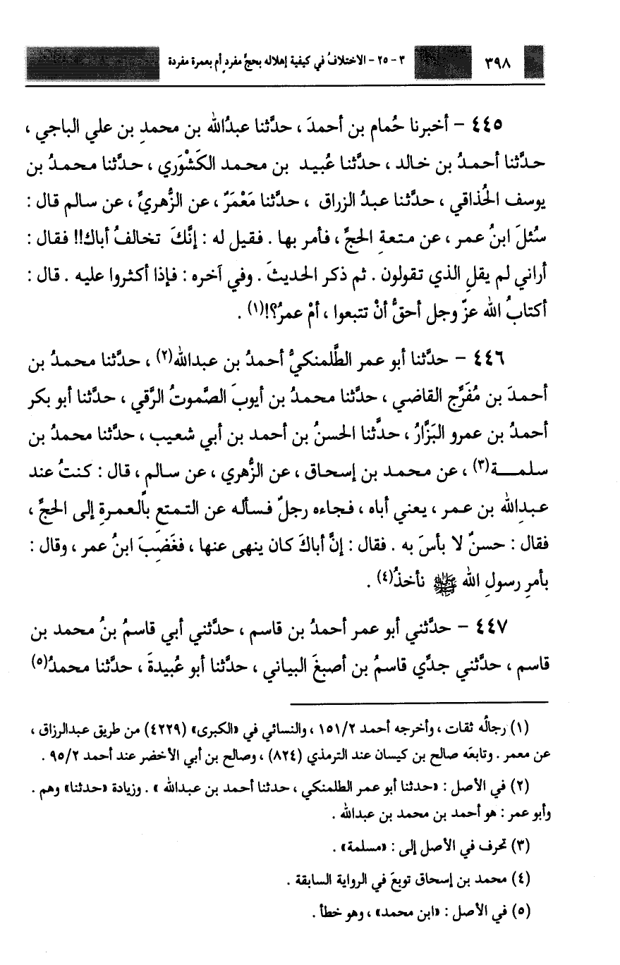 445 - أَخْبَرَنَا حُمَامُ بْنُ أَحْمَدَ، حَدَّثَنَا عَبْدُ اللَّهِ بْنُ مُحَمَّدِ بْنِ عَلِيٍّ الْبَاجِيُّ، حَدَّثَنَا أَحْمَدُ بْنُ خَالِدٍ، حَدَّثَنَا عُبَيْدُ بْنُ مُحَمَّدٍ الْكَشْوَرِيُّ، حَدَّثَنَا مُحَمَّدُ بْنُ يُوسُفَ الْحُذَاقِيُّ، حَدَّثَنَا عَبْدُ الرَّزَّاقِ، حَدَّثَنَا مَعْمَرٌ، عَنِ الزُّهْرِيِّ، عَنْ سَالِمٍ، قَالَ: سُئِلَ ابْنُ عُمَرَ عَنْ §مُتْعَةِ الْحَجِّ، فَأَمَرَ بِهَا فَقِيلَ لَهُ: إِنَّكَ تُخَالِفُ أَبَاكَ، فَقَالَ: «أَرَانِي لَمْ يَقُلِ الَّذِي تَقُولُونَ» ، ثُمَّ ذَكَرَ الْحَدِيثَ، وَفِي آخِرِهِ: فَإِذَا أَكْثَرُوا عَلَيْهِ قَالَ: أَكِتَابُ اللَّهِ عَزَّ وَجَلَّ أَحَقُّ أَنْ تَتَّبِعُوا أَمْ عُمَرُ؟