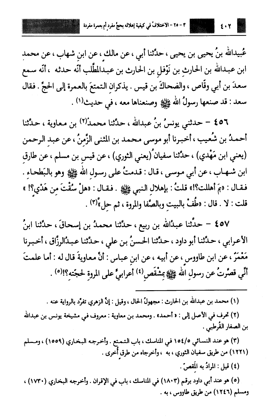 456 - حَدَّثَنِي يُونُسُ بْنُ عَبْدِ اللَّهِ، حَدَّثَنَا مُحَمَّدُ بْنُ مُعَاوِيَةَ، حَدَّثَنَا أَحْمَدُ بْنُ شُعَيْبٍ، أَخْبَرَنَا أَبُو مُوسَى مُحَمَّدُ بْنُ الْمُثَنَّى الزَّمِنُ، عَنْ عَبْدِ الرَّحْمَنِ يَعْنِي ابْنَ مَهْدِيٍّ، حَدَّثَنَا سُفْيَانُ يَعْنِي الثَّوْرِيَّ، عَنْ قَيْسِ بْنِ مُسْلِمٍ، عَنْ طَارِقِ بْنِ شِهَابٍ، عَنْ أَبِي مُوسَى، قَالَ: §قَدِمْتُ عَلَى رَسُولِ اللَّهِ صَلَّى اللهُ عَلَيْهِ وَسَلَّمَ وَهُوَ بِالْبَطْحَاءِ فَقَالَ: «بِمَ أَهْلَلْتَ» ؟ قُلْتُ: بِإِهْلَالِ النَّبِيِّ صَلَّى اللهُ عَلَيْهِ وَسَلَّمَ، فَقَالَ: «هَلْ سُقْتَ مِنْ هَدْيٍ» ؟ قُلْتُ: لَا، قَالَ: «طُفْ بِالْبَيْتِ وَبِالصَّفَا وَالْمَرْوَةِ ثُمَّ حِلَّ»