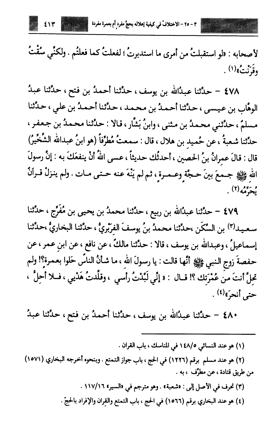478 - حَدَّثَنَا عَبْدُ اللَّهِ بْنُ يُوسُفَ، حَدَّثَنَا أَحْمَدُ بْنُ فَتْحٍ، حَدَّثَنَا عَبْدُ الْوَهَّابِ بْنُ عِيسَى، حَدَّثَنَا أَحْمَدُ بْنُ مُحَمَّدٍ، حَدَّثَنَا أَحْمَدُ بْنُ عَلِيٍّ، حَدَّثَنَا مُسْلِمٌ، حَدَّثَنِي مُحَمَّدُ بْنُ مُثَنَّى، وَابْنُ بَشَّارٍ، قَالَا: حَدَّثَنَا مُحَمَّدُ بْنُ جَعْفَرٍ، حَدَّثَنَا شُعْبَةُ، عَنْ حُمَيْدِ بْنِ هِلَالٍ، قَالَ: سَمِعْتُ مُطَرِّفًا هُوَ ابْنُ عَبْدِ اللَّهِ الشِّخِّيرِ، قَالَ: قَالَ عِمْرَانُ بْنُ الْحُصَيْنِ: أُحَدِّثُكَ حَدِيثًا عَسَى اللَّهُ أَنْ يَنْفَعَكَ بِهِ: إِنَّ رَسُولَ اللَّهِ صَلَّى اللهُ عَلَيْهِ وَسَلَّمَ §جَمَعَ بَيْنَ حَجَّةٍ وَعُمْرَةٍ، ثُمَّ لَمْ يَنْهَ عَنْهُ حَتَّى مَاتَ، وَلَمْ يَنْزِلْ قُرْآنٌ يُحَرِّمُهُ