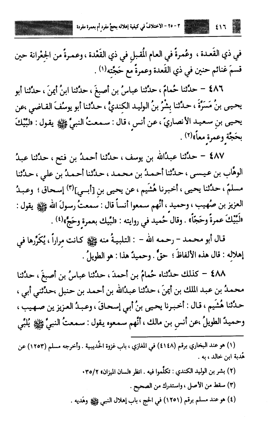 488 - كَذَلِكَ حَدَّثَنَاهُ حُمَامُ بْنُ أَحْمَدَ، حَدَّثَنَا عَبَّاسُ بْنُ أَصْبَغَ، حَدَّثَنَا مُحَمَّدُ بْنُ عَبْدِ الْمَلِكِ بْنِ أَيْمَنَ، حَدَّثَنَا عَبْدُ اللَّهِ بْنُ أَحْمَدَ بْنِ حَنْبَلٍ، حَدَّثَنِي أَبِي، حَدَّثَنَا هُشَيْمٌ، قَالَ: أَخْبَرَنَا يَحْيَى بْنُ أَبِي إِسْحَاقَ، وَعَبْدُ الْعَزِيزِ بْنُ صُهَيْبٍ، وَحُمَيْدٌ الطَّوِيلُ، عَنْ أَنَسِ بْنِ مَالِكٍ، أَنَّهُمْ سَمِعُوهُ يَقُولُ: سَمِعْتُ النَّبِيَّ صَلَّى اللهُ عَلَيْهِ وَسَلَّمَ يُلَبِّي -[417]- بِالْعُمْرَةِ وَالْحَجِّ جَمِيعًا، يَقُولُ: §«لَبَّيْكَ عُمْرَةً وَحَجًّا»