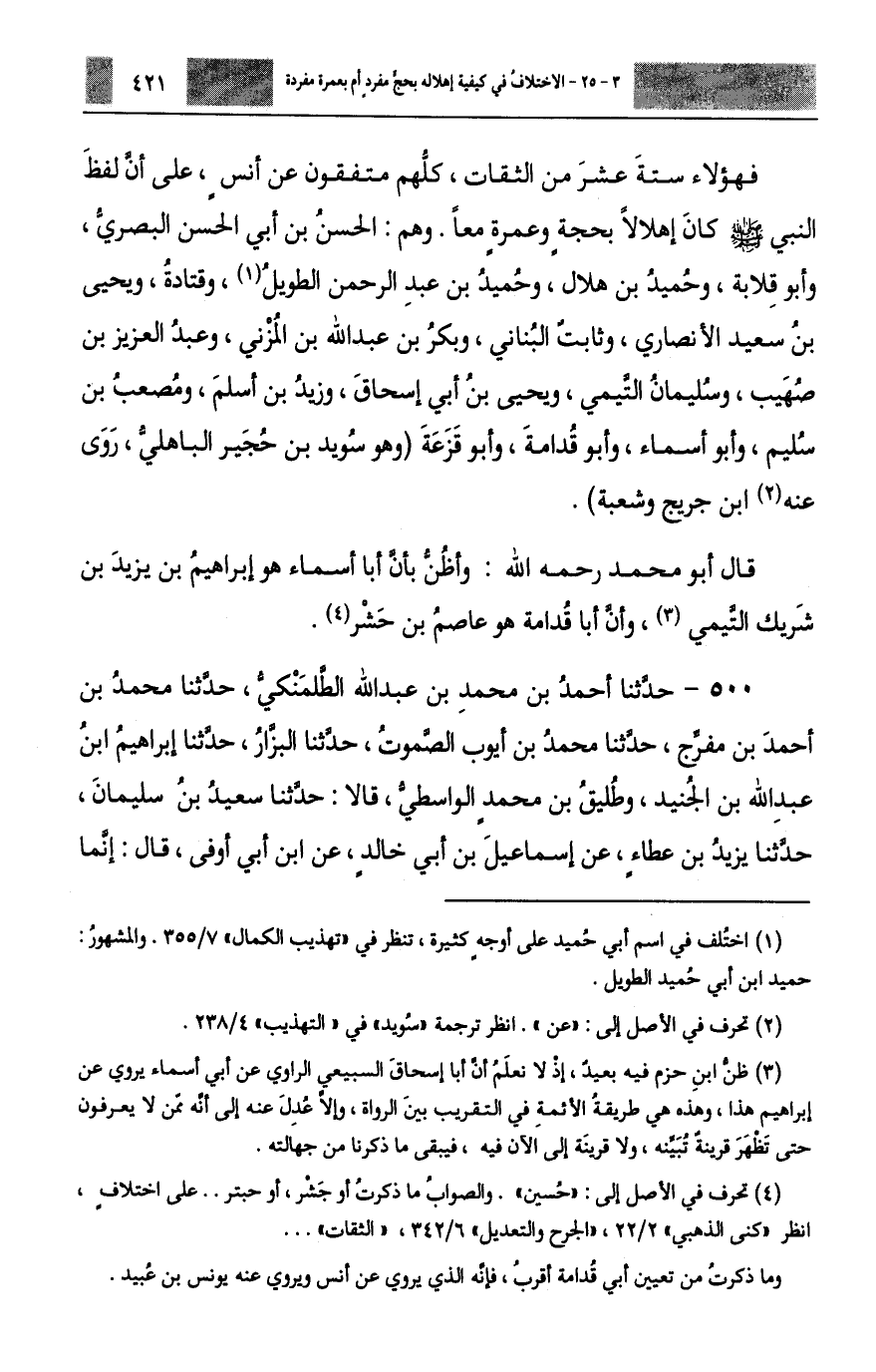 500 - حَدَّثَنَا أَحْمَدُ بْنُ مُحَمَّدِ بْنِ عَبْدِ اللَّهِ الطَّلَمَنْكِيُّ، حَدَّثَنَا مُحَمَّدُ بْنُ أَحْمَدَ بْنِ مُفَرِّجٍ، حَدَّثَنَا مُحَمَّدُ بْنُ أَيُّوبَ الصَّمُوتُ، حَدَّثَنَا الْبَزَّارُ، حَدَّثَنَا إِبْرَاهِيمُ بْنُ عَبْدِ اللَّهِ بْنِ الْجُنَيْدِ، وَطُلَيْقُ بْنُ مُحَمَّدٍ الْوَاسِطِيُّ، قَالَا: حَدَّثَنَا سَعِيدُ بْنُ سُلَيْمَانَ، حَدَّثَنَا يَزِيدُ بْنُ عَطَاءٍ، عَنْ إِسْمَاعِيلَ بْنِ أَبِي خَالِدٍ، عَنِ ابْنِ أَبِي أَوْفَى، قَالَ: §إِنَّمَا -[422]- جَمَعَ رَسُولُ اللَّهِ صَلَّى اللهُ عَلَيْهِ وَسَلَّمَ بَيْنَ الْحَجِّ وَالْعُمْرَةِ؛ لِأَنَّهُ عَلِمَ أَنَّهُ لَا يَحُجُّ بَعْدَ عَامِهِ ذَلِكَ قَالَ أَبُو مُحَمَّدٍ رَحِمَهُ اللَّهُ: لَمْ يَخْفَ عَنَّا أَنْ قَدْ قِيلَ: إِنَّ يَزِيدَ بْنَ عَطَاءٍ أَخْطَأَ فِي إِسْنَادِهِ، وَلَكِنْ مَنِ ادَّعَى الْخَطَأَ عَلَى الرَّاوِي فَعَلَيْهِ الدَّلِيلُ، وَهَؤُلَاءِ اثْنَا عَشَرَ مِنَ الصَّحَابَةِ بِالْأَسَانِيدِ الصِّحَاحِ كُلُّهُمْ يَصِفُ بِغَايَةِ الْبَيَانِ أَنَّ رَسُولَ اللَّهِ صَلَّى اللهُ عَلَيْهِ وَسَلَّمَ كَانَ قَارِنًا، وَهُمْ: عَائِشَةُ أُمُّ الْمُؤْمِنِينَ، وَعَبْدُ اللَّهِ بْنُ عُمَرَ، وَجَابِرُ بْنُ عَبْدِ اللَّهِ الْأَنْصَارِيُّ، وَعَبْدُ اللَّهِ بْنُ الْعَبَّاسِ، وَعُمَرُ بْنُ الْخَطَّابِ، وَعَلِيُّ بْنُ أَبِي طَالِبٍ، وَعِمْرَانُ بْنُ الْحُصَيْنِ، وَالْبَرَاءُ بْنُ عَازِبٍ، وَحَفْصَةُ أُمُّ الْمُؤْمِنِينَ، وَأَنَسُ بْنُ مَالِكٍ، وَأَبُو قَتَادَةَ، وَابْنُ أَبِي أَوْفَى، وَقَدْ رُوِيَ أَيْضًا أَنَّهُ صَلَّى اللهُ عَلَيْهِ وَسَلَّمَ قَرَنَ بَيْنَ حَجَّةٍ وَعُمْرَةٍ فِي حَجَّةِ الْوَدَاعِ عَنْ سُرَاقَةَ، وَأَبِي طَلْحَةَ، وَالْهِرْمَاسِ بْنِ زِيَادٍ الْبَاهِلِيِّ " وَرُوِيَ عَنْ أُمِّ سَلَمَةَ أُمِّ الْمُؤْمِنِينَ أَنَّهُ صَلَّى اللهُ عَلَيْهِ وَسَلَّمَ أَمَرَ أَهْلَهُ بِالْقِرَانِ. قَالَ أَبُو مُحَمَّدٍ رَحِمَهُ اللَّهُ: فَظَاهِرُ الْأَمْرِ أَنَّ الرِّوَايَةَ مُخْتَلِفَةٌ عَنْ عَائِشَةَ، وَجَابِرٍ، وَابْنِ عُمَرَ، وَابْنِ عَبَّاسٍ فَإِنَّ هَؤُلَاءِ عَنْهُمْ كَمَا ذَكَرْنَا مَا يَدُلُّ عَلَى الْإِفْرَادِ لِلْحَجِّ -[423]-، وَمَا يَدُلُّ عَلَى التَّمَتُّعِ وَمَا يَدُلُّ عَلَى الْقِرَانِ حَاشَا جَابِرًا فَإِنَّهُ إِنَّمَا رُوِيَ عَنْهُ الْقِرَانُ وَالْإِفْرَادُ فَقَطْ، وَحَاشَا سُرَاقَةَ فَإِنَّهُ إِنَّمَا رُوِيَ عَنْهُ التَّمَتُّعُ وَالْقِرَانُ فَقَطْ، وَكَذَلِكَ أَيْضًا عَنْ عُمَرَ، وَعَلِيٍّ، وَعِمْرَانَ فَإِنَّهُ رُوِيَ عَنْهُمُ التَّمَتُّعُ وَالْقِرَانُ. وَأَمَّا عُثْمَانُ، وَسَعْدٌ، وَمُعَاوِيَةُ فَلَمْ يُرْوَ عَنْهُمْ أَنَّ النَّبِيَّ صَلَّى اللهُ عَلَيْهِ وَسَلَّمَ كَانَ إِلَّا مُتَمَتِّعًا فَقَطْ، وَكَذَلِكَ الِاسْتِدْلَالُ مِنْ حَدِيثِ أَبِي مُوسَى أَيْضًا إِنَّمَا يَدُلُّ عَلَى التَّمَتُّعِ فَقَطْ؛ لِأَنَّهُ أَخْبَرَ النَّبِيَّ صَلَّى اللهُ عَلَيْهِ وَسَلَّمَ بِأَنَّهُ أَهَلَّ إِهْلَالًا كَإِهْلَالِ رَسُولِ اللَّهِ صَلَّى اللهُ عَلَيْهِ وَسَلَّمَ، فَأَمَرَهُ رَسُولُ اللَّهِ صَلَّى اللهُ عَلَيْهِ وَسَلَّمَ بِأَنْ يَحِلَّ بِعُمْرَةٍ وَحَجٍّ مِنْ شَهْرِهِ ذَلِكَ. وَأَمَّا حَفْصَةُ، وَالْبَرَاءُ بْنُ عَازِبٍ، وَأَنَسُ بْنُ مَالِكٍ، وَأَبُو قَتَادَةَ، وَابْنُ أَبِي أَوْفَى فَلَمْ يُرْوَ عَنْهُمْ مِنْ فِعْلِهِ عَلَيْهِ السَّلَامُ شَيْءٌ غَيْرُ الْقِرَانِ فَقَطْ. فَأَمَّا عَنْ صِحَّةِ الْبَحْثِ وَتَحْقِيقِ النَّظَرِ فَلَيْسَ شَيْءٌ مِنْ ذَلِكَ مُضْطَرِبًا، بَلْ كُلُّهُ مُتَّفِقٌ، وَالْحَمْدُ لِلَّهِ رَبِّ الْعَالَمِينَ عَلَى مَا بَيَّنْتُهُ إِنْ شَاءَ اللَّهُ عَزَّ وَجَلَّ، وَل
