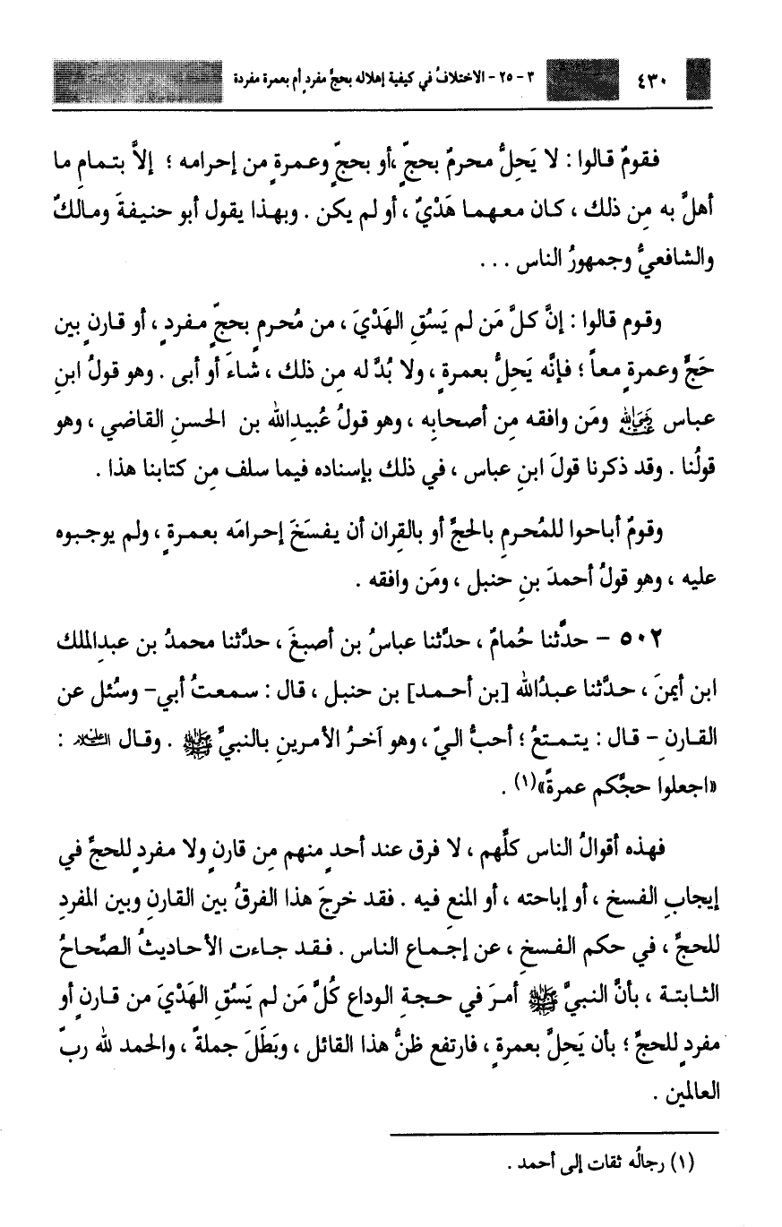 502 - حَدَّثَنَا حُمَامٌ، حَدَّثَنَا عَبَّاسُ بْنُ أَصْبَغَ، حَدَّثَنَا مُحَمَّدُ بْنُ عَبْدِ الْمَلِكِ بْنِ أَيْمَنَ، حَدَّثَنَا عَبْدُ اللَّهِ بْنُ أَحْمَدَ بْنِ حَنْبَلٍ، قَالَ: سَمِعْتُ أَبِي وَسُئِلَ، عَنِ الْقَارِنِ؟ قَالَ: §يَتَمَتَّعُ أَحَبُّ إِلَيَّ، هُوَ آخِرُ الْأَمْرَيْنِ بِالنَّبِيِّ صَلَّى اللهُ عَلَيْهِ وَسَلَّمَ، وَقَالَ عَلَيْهِ السَّلَامُ: «اجْعَلُوا حَجَّكُمْ عُمْرَةً» فَهَذِهِ أَقْوَالُ النَّاسِ كُلِّهِمْ، لَا فَرْقَ عِنْدَ أَحَدٍ مِنْهُمْ مِنْ قَارِنٍ وَلَا مُفْرِدٍ لِلْحَجِّ فِي إِيجَابِ الْفَسْخِ، أَوْ إِبَاحَتِهِ، أَوِ الْمَنْعِ فِيهِ، فَقَدْ خَرَجَ هَذَا الْفَرَقُ بَيْنَ الْقَارِنِ وَبَيْنَ الْمُفْرِدِ لِلْحَجِّ فِي حُكْمِ الْفَسْخِ عَنْ إِجْمَاعِ النَّاسِ، فَقَدْ جَاءَتِ الْأَحَادِيثُ الصِّحَاحُ الثَّابِتَةُ بِأَنَّ النَّبِيَّ صَلَّى اللهُ عَلَيْهِ وَسَلَّمَ أَمَرَ فِي حَجَّةِ الْوَدَاعِ كُلَّ مَنْ لَمْ يَسُقِ الْهَدْيَ مِنْ قَارِنٍ أَوْ مُفْرِدٍ لِلْحَجِّ بِأَنْ يَحِلَّ بِعُمْرَةٍ، فَارْتَفَعَ ظَنُّ هَذَا الْقَائِلِ وَبَطَلَ جُمْلَةً وَالْحَمْدُ لِلَّهِ رَبِّ الْعَالَمِينَ -[431]-. فَمِنْهَا الْحَدِيثُ الَّذِي صَدَّرْنَا بِهِ فِي بَابِ الْفَسْخِ مِنْ كِتَابِنَا هَذَا مِنْ طَرِيقِ سَالِمٍ، عَنْ أَبِيهِ، عَنِ النَّبِيِّ صَلَّى اللهُ عَلَيْهِ وَسَلَّمَ، وَمِنْ طَرِيقِ عُرْوَةَ، عَنْ عَائِشَةَ، عَنِ النَّبِيِّ صَلَّى اللهُ عَلَيْهِ وَسَلَّمَ أَنَّ النَّبِيَّ صَلَّى اللهُ عَلَيْهِ وَسَلَّمَ تَمَتَّعَ، وَتَمَتَّعَ النَّاسُ مَعَهُ، فَبَدَأَ رَسُولُ اللَّهِ صَلَّى اللهُ عَلَيْهِ وَسَلَّمَ فأَهَلَّ بِالْعُمْرَةِ، ثُمَّ أَهَلَّ بِالْحَجِّ، وَتَمَتَّعَ النَّاسُ مَعَهُ بِالْعُمْرَةِ إِلَى الْحَجِّ، وَأَنَّهُ عَلَيْهِ السَّلَامُ أَمَرَ مَنْ لَا هَدْيَ مَعَهُ مِنْهُمْ أَنْ يَحِلَّ بِعُمْرَةٍ وَالْحَلَّ كُلَّهُ، ثُمَّ يُهِلُّ يَوْمَ التَّرْوِيَةِ بِالْحَجِّ، فَفِي هَذَا الْحَدِيثِ نَصٌّ أَنَّهُ عَلَيْهِ السَّلَامُ أَمَرَ الْقَارِنِينَ الَّذِينَ لَا هَدْيَ مَعَهُمْ بِالْإِحْلَالِ بِعُمْرَةٍ، وَفَسْخِ إِحْرَامِهِمْ