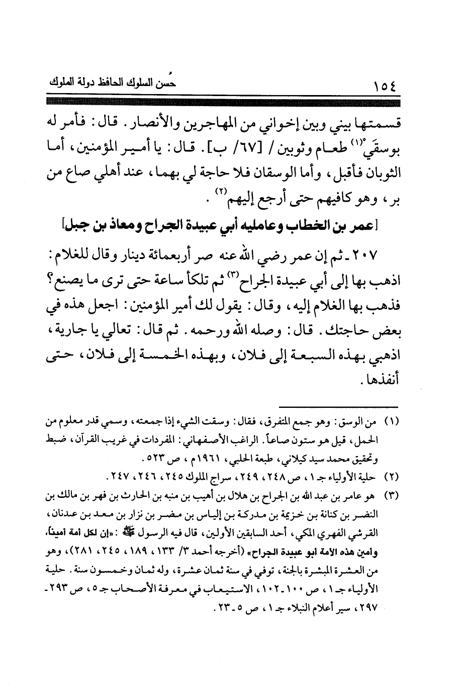 207 - ثمَّ إِن عمر رَضِي الله عَنهُ صر أَرْبَعمِائَة دِينَار وَقَالَ للغلام اذْهَبْ بهَا إِلَى أبي عُبَيْدَة الْجراح ثمَّ تلكأ سَاعَة حَتَّى ترى مَا يصنع فَذهب بهَا الْغُلَام إِلَيْهِ وَقَالَ يَقُول لَك أَمِير الْمُؤمنِينَ اجْعَل هَذِه فِي بعض حَاجَتك قَالَ وَصله الله ورحمه ثمَّ قَالَ تعالي يَا جَارِيَة اذهبي بِهَذِهِ السَّبْعَة إِلَى فلَان وبهذه الْخَمْسَة إِلَى فلَان حَتَّى أنفذها