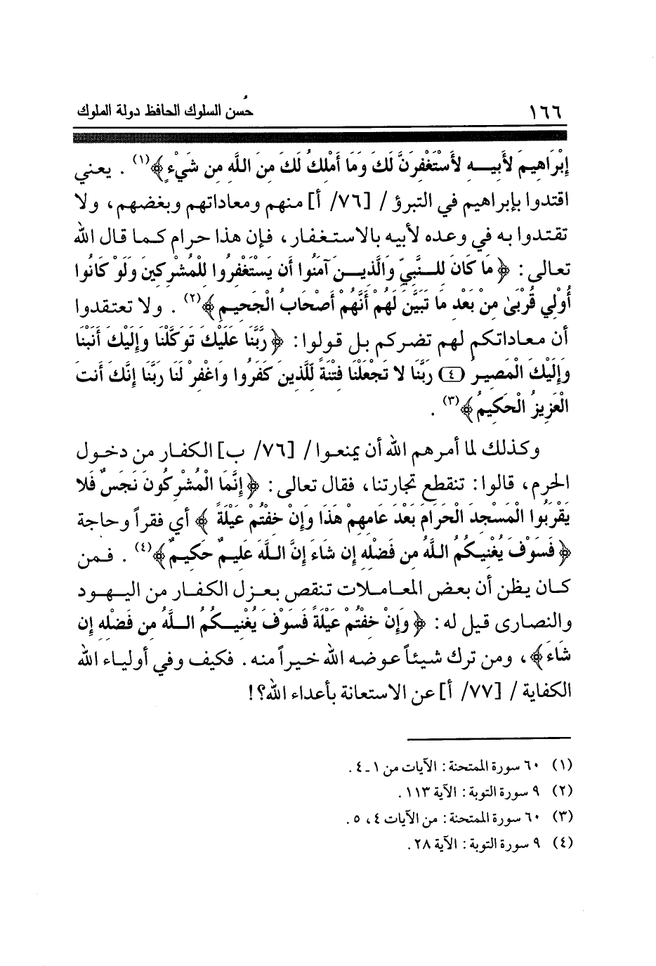 وَكَذَلِكَ لما أَمرهم الله أَن يمنعوا الْكفَّار من دُخُول الْحرم قَالُوا تَنْقَطِع تِجَارَتِنَا فَقَالَ تَعَالَى {إِنَّمَا الْمُشْركُونَ نجس فَلَا يقربُوا الْمَسْجِد الْحَرَام بعد عَامهمْ هَذَا وَإِن خِفْتُمْ عيلة} أَي فقرا وحاجة {فَسَوف يغنيكم الله من فَضله إِن شَاءَ إِن الله عليم حَكِيم} فَمن كَانَ يظنّ أَن بعض الْمُعَامَلَات تنقص بعزل الْكفَّار من الْيَهُود وَالنَّصَارَى قيل لَهُ (وَإِن خِفْتُمْ عيلة فَسَوف يغنيكم الله من فَضله إِن شَاءَ) وَمن ترك شَيْئا عوضه الله خيرا مِنْهُ فَكيف وَفِي أَوْلِيَاء الله الْكِفَايَة عَن الِاسْتِعَانَة بأعداء الله
