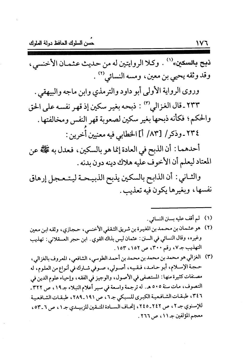 233 - قَالَ الْغَزالِيّ ذبحه بِغَيْر سكين إِذْ قهر نَفسه على الْحق وَالْحكم فَكَأَنَّهُ ذَبحهَا بِغَيْر سكين لصعوبة قهر النَّفس ومخالفتها