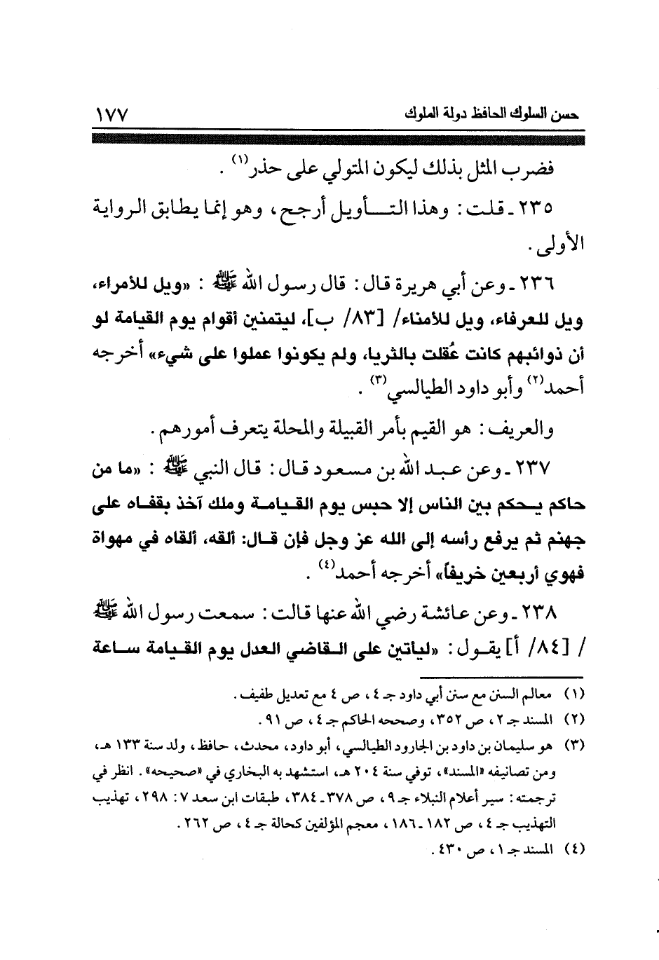 236 - وَعَن أبي هُرَيْرَة قَالَ قَالَ رَسُول الله صلى الله عَلَيْهِ وَسلم (ويل لِلْأُمَرَاءِ ويل للعرفاء ويل للأمناء ليتمنين أَقوام يَوْم الْقِيَامَة لَو أَن ذوائبهم كَانَت عقلت بِالثُّرَيَّا وَلم يَكُونُوا عمِلُوا على شَيْء) أخرجه أَحْمد وَأَبُو دَاوُد الطَّيَالِسِيّ