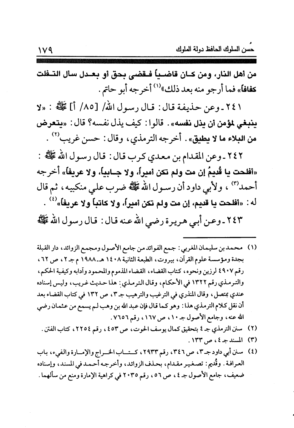 242 - وَعَن الْمِقْدَام بن معدي كرب قَالَ قَالَ رَسُول الله صلى الله عَلَيْهِ وَسلم (أفلحت يَا قديم إِن مت وَلم تكن أَمِيرا وَلَا جابيا وَلَا عريفا) أخرجه أَحْمد وَلأبي دَاوُد أَن رَسُول الله صلى الله عَلَيْهِ وَسلم ضرب على مَنْكِبَيْه ثمَّ قَالَ لَهُ (أفلحت يَا قديم إِن مت وَلم تكن أَمِيرا وَلَا كَاتبا وَلَا عريفا)