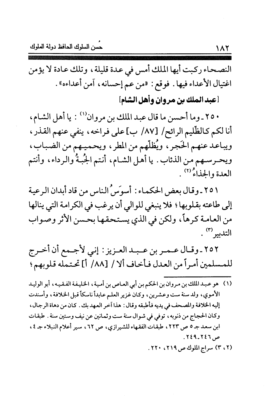 250 - وَمَا أحسن مَا قَالَ عبد الْملك بن مَرْوَان يَا أهل الشَّام أَنا لكم كالظليم الرَّائِح على فِرَاخه يَنْفِي عَنْهُم القذر ويباعد عَنْهُم الْحجر ويظلهم من الْمَطَر ويحميهم من الضباب ويحرسهم من الذئاب يَا أهل الشَّام أَنْتُم الْجُبَّة والرداء وَأَنْتُم الْعدة والجذاء