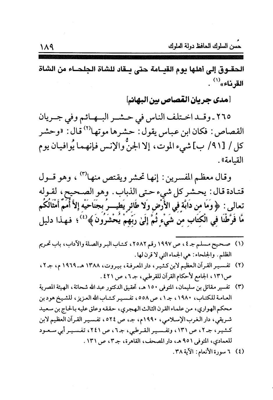 265 - وَقد اخْتلف النَّاس فِي حشر الْبَهَائِم وَفِي جَرَيَان الْقصاص فَكَانَ ابْن عَبَّاس يَقُول حشرها مَوتهَا قَالَ وَحشر كل شَيْء الْمَوْت إِلَّا الْجِنّ وَالْإِنْس فَإِنَّهُمَا يوافيان يَوْم الْقِيَامَة