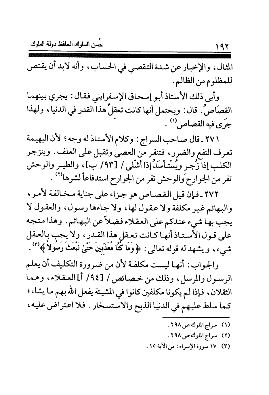 271 - قَالَ صَاحب السراج وَكَلَام الْأُسْتَاذ لَهُ وَجه لِأَن الْبَهِيمَة تعرف النَّفْع وَالضَّرَر فتنفر من العصى وَتقبل على الْعلف وينزجر الْكَلْب إِذا زجر ويستأسد إِذا أشلى وَالطير والوحش تَفِر من الْجَوَارِح والوحش تَفِر من الْجَوَارِح استدفاعا لشرها