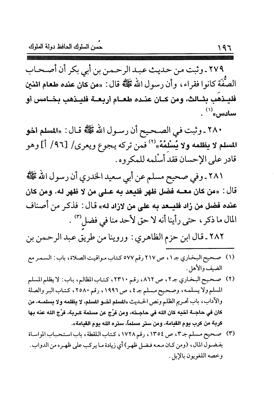 280 - وَثَبت فِي الصَّحِيح أَن رَسُول الله صلى الله عَلَيْهِ وَسلم قَالَ (الْمُسلم أَخُو الْمُسلم لَا يَظْلمه وَلَا يُسلمهُ) فَمن تَركه يجوع ويعرى وَهُوَ قَادر على الْإِحْسَان فقد أسلمه للمكروه
