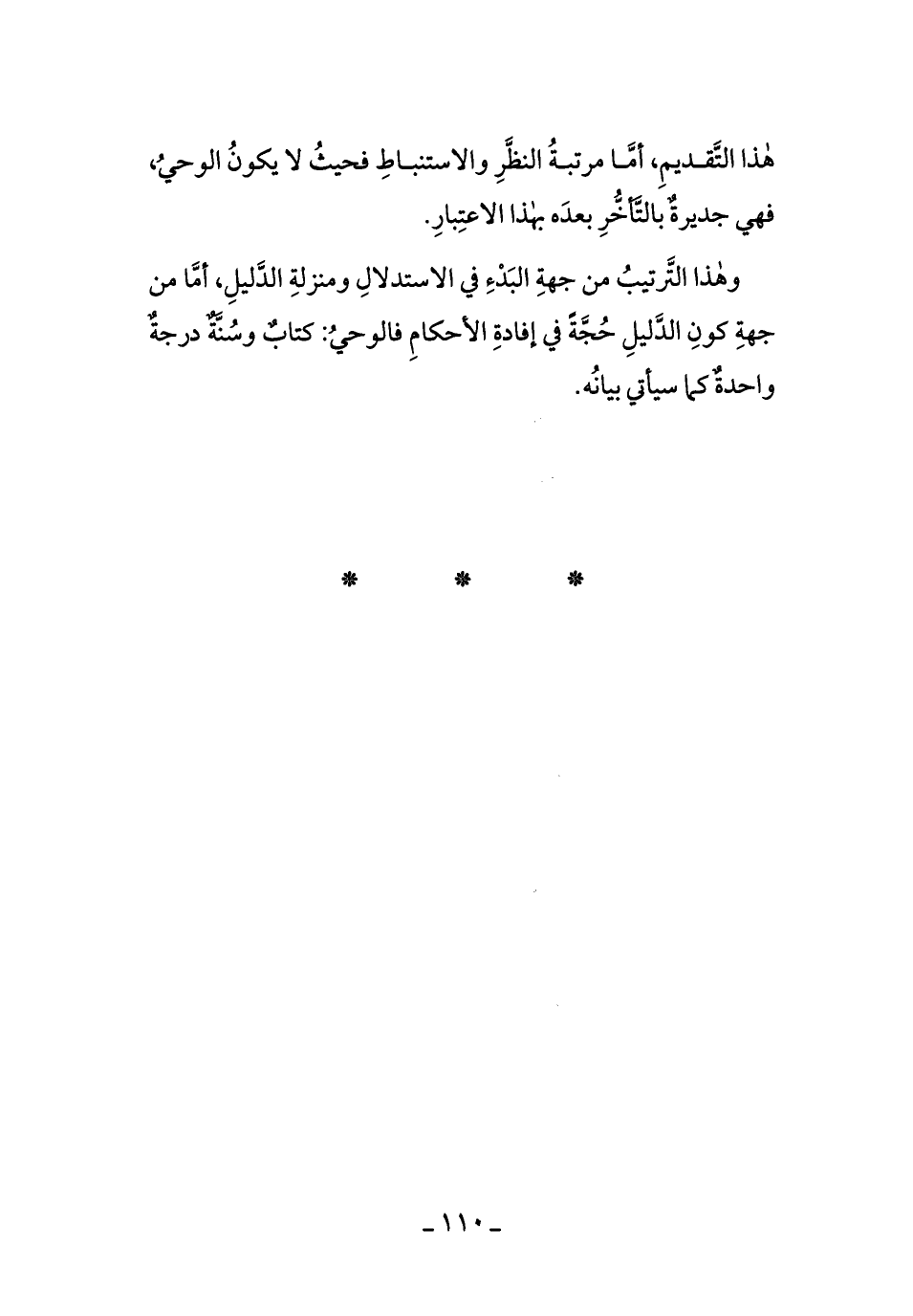 هذا التَّقديمِ، أمَّا مرتبةُ النَّظرِ والاستنباطِ فحيثُ لا يكونُ الوحيُ، فهيَ جديرةٌ بالتَّأخُّرِ بعدَهُ بهذا الاعتبارِ.