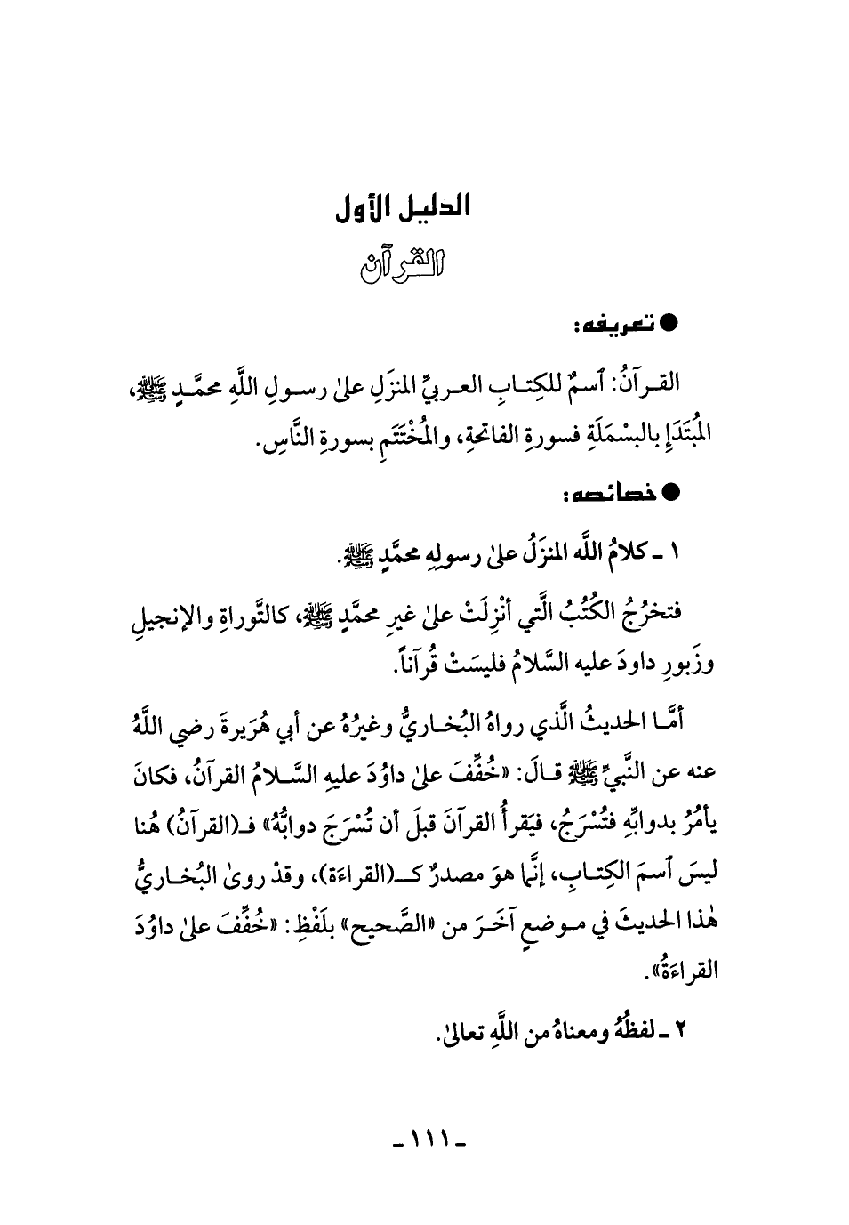 1ـ كلامُ الله المنزَلُ على رسولهِ محمَّدٍ - صلى الله عليه وسلم -.