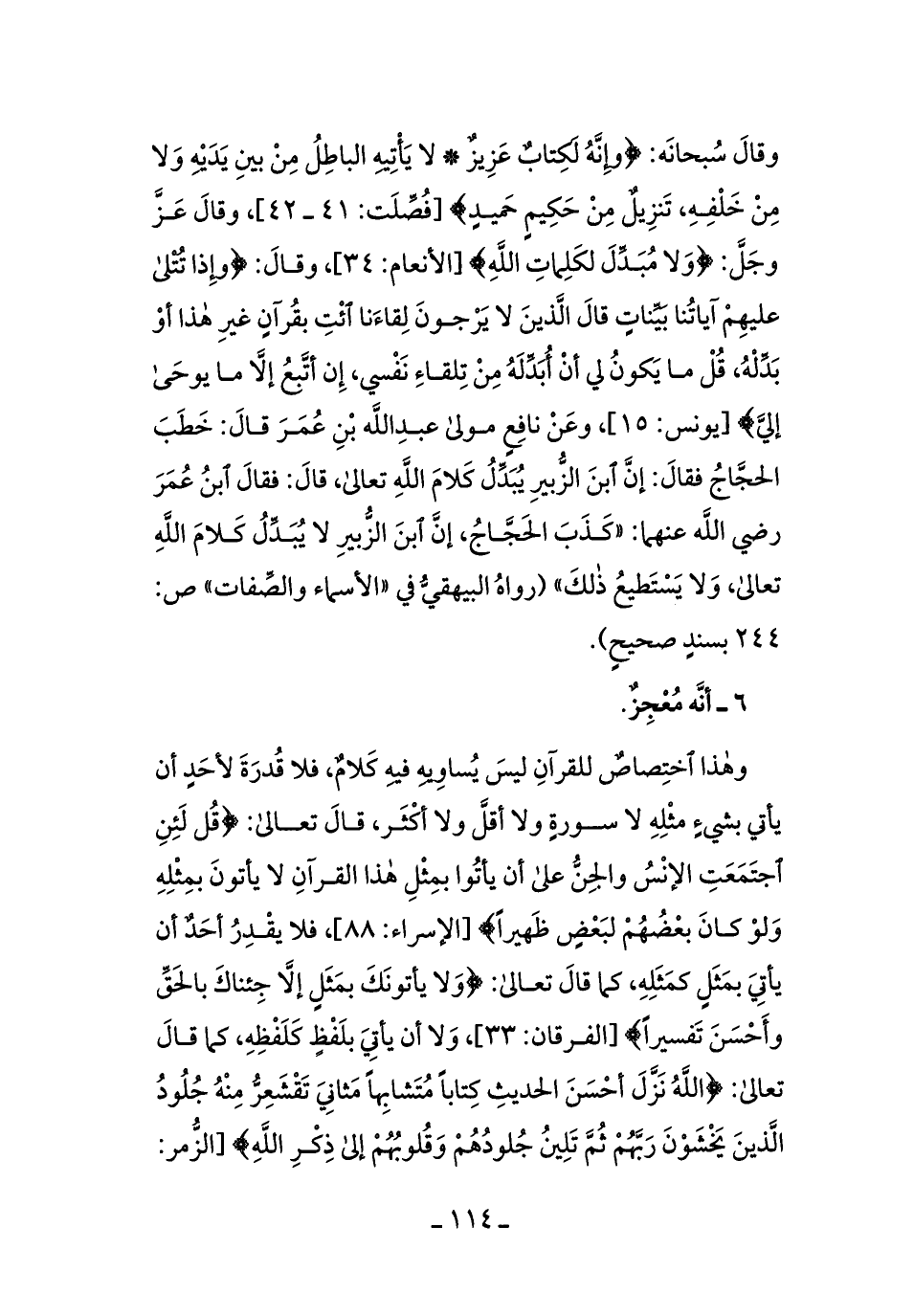 وقال سُبحانَهُ: {وَإِنَّهُ لَكِتَابٌ عَزِيزٌ (41) لَا يَأْتِيهِ الْبَاطِلُ مِنْ بَيْنِ يَدَيْهِ وَلَا مِنْ خَلْفِهِ تَنْزِيلٌ مِنْ حَكِيمٍ حَمِيدٍ} [فصلت: 41ـ 42] ، وقال عزَّوجلَّ: {وَلَا مُبَدِّلَ لِكَلِمَاتِ اللَّهِ} [الأنعام: 43] ، وقال: {وَإِذَا تُتْلَى عَلَيْهِمْ آَيَاتُنَا بَيِّنَاتٍ قَالَ الَّذِينَ لَا يَرْجُونَ لِقَاءَنَا ائْتِ بِقُرْآَنٍ غَيْرِ هَذَا أَوْ بَدِّلْهُ قُلْ مَا يَكُونُ لِي أَنْ أُبَدِّلَهُ مِنْ تِلْقَاءِ نَفْسِي إِنْ أَتَّبِعُ إِلَّا مَا يُوحَى إِلَى} [يونس: 15] ، وعن نافعِ مولى عبد الله بنِ عُمرَ قال: خطبَ الحجَّاجُ فقال: إنَّ ابنَ الزُّبيرِ يُبدِّلُ كلامَ الله تعالى، قال: فقالَ ابنُ عُمرَ رضي الله عنهما: ((كذَبَ الحجَّاجُ، إنَّ ابنَ الزُّبيرِ لا يُبدِّلُ كلاَمَ اللهِ تعالى، ولا يستطيعُ ذلكَ)) [رواهُ البيهقيُّ في ((الأسماء والصِّفات)) ، ص244 بسندٍ صحيحٍ] .