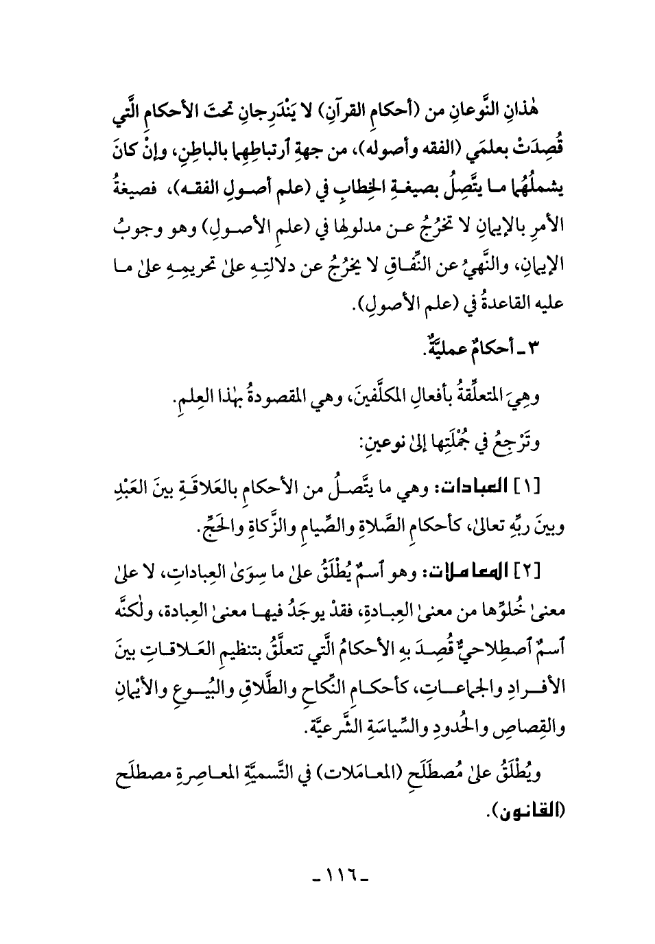 هذانِ النَّوعانِ من (أحكامِ القُرآنِ) لا ينْدَرِجَانِ تحتَ الأحكامِ الَّتي قُصدتْ بعلمَي (الفقه وأصوله) من جهةِ ارتباطِهِمَا بالبَاطِنِ، وإنْ كانَ يشملُهُمَا ما يتَّصِلُ بصيغَةِ الخِطابِ في (علمِ أصولِ الفقه) ، فصيغةُ الأمرِ بالإيمانِ لاتخرُجُ عن مدلولهَا في (علمِ الأصولِ) وهوَ وجوبُ الإيمانِ، والنَّهيُ عن النِّفاقِ لا يخرُجُ عن دلالتِهِ على تحريمِهِ على ما عليه القاعِدَةُ ي (علمِ الأصولِ) .