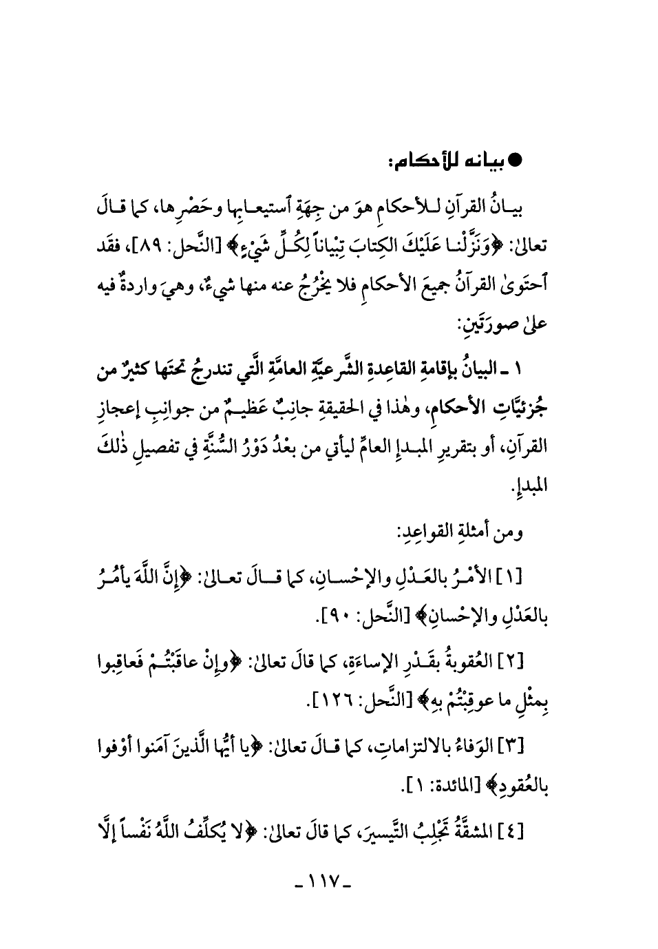1ـ البيانُ بإقامَةِ القاعِدَةِ الشَّرعيَّةِ العَامَّةِ الَّتي تندرجُ تحتَهَا كثيرٌ من جُزئيَّاتِ الأحكامِ، وهذا في الحقيقةِ جانبٌ عظيمٌ من جوانبِ إعجازِ القُرآنِ، أو بتقريرِ المبدإ العامِّ ليأتي من بعدُ دَوْرُ السُّنَّةِ في تفصيلِ ذلك المبدإِ.