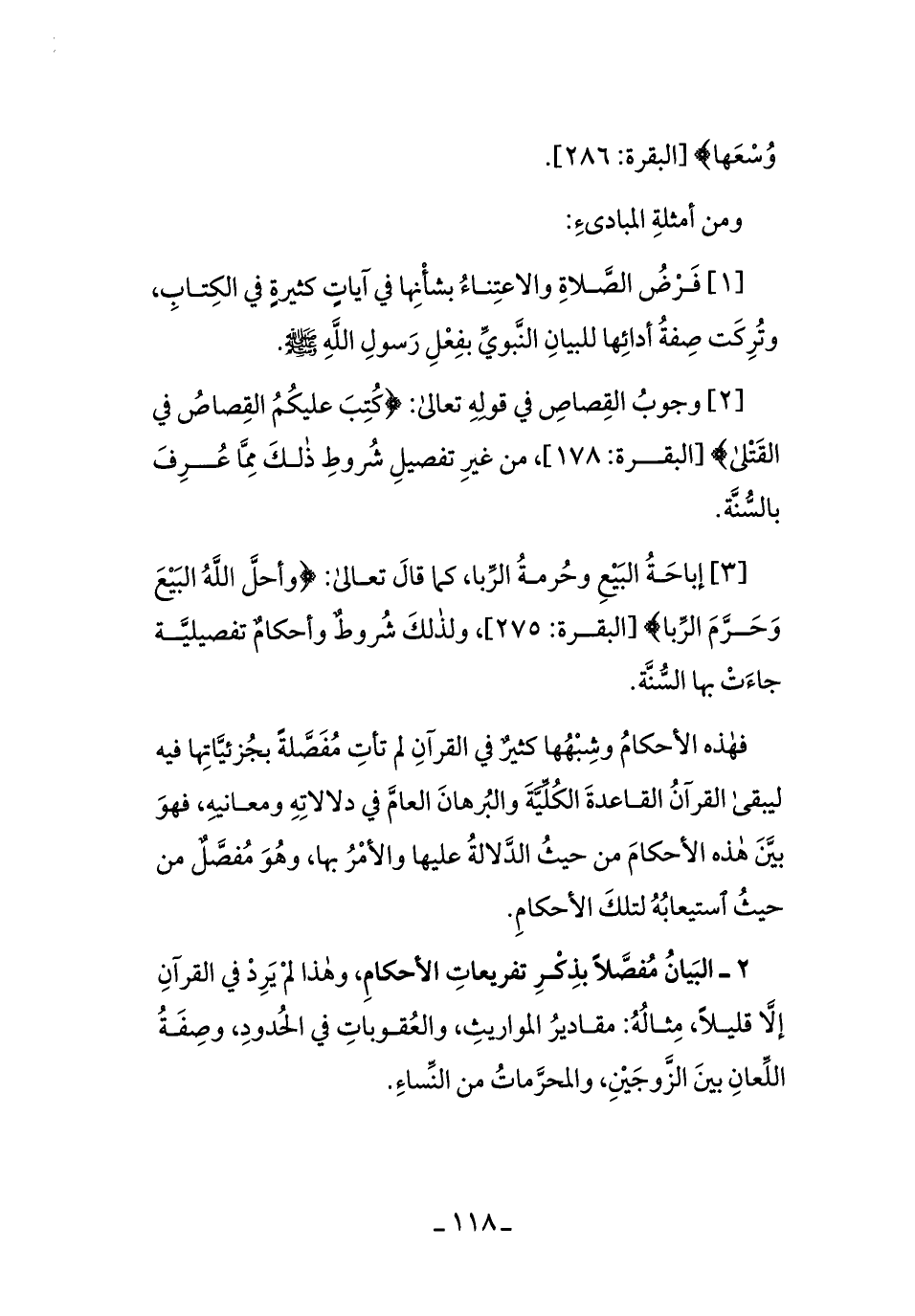 فهذه الأحكامُ وشِبهُها كثيرٌ في القرآن لم تأتِ مفصَّلةً بجزئيَّاتهَا فيه ليبقى القرآنُ القاعدة الكُليَّة والبُرهانَ العامَّ في دلالاته ومعانيه، فهوَ بيَّن هذه الأحكامَ من حيثُ الدَّلالة عليها والأمرُ بها، وهوَ مفصَّلٌ من حيثُ استيعابُهُ لتلكَ الأحكامِ.