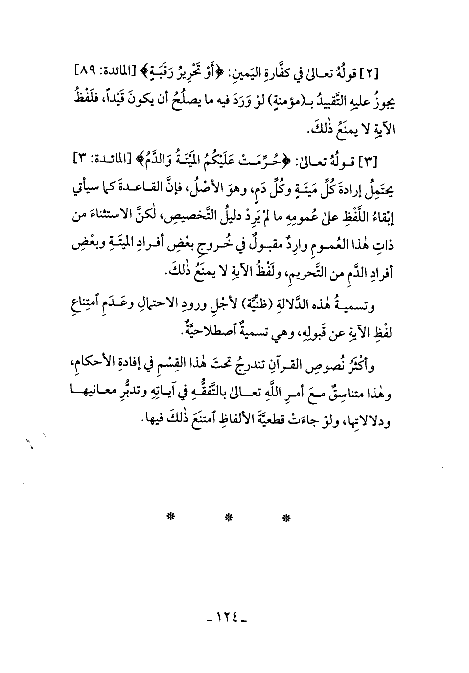 [2] قوله تعالى في كفَّارَةِ اليمينِ: {أَوْ تَحْرِيرُ رَقَبَةٍ} [المائدة: 89] ، يجوزُ عليهِ التَّقييدُ بـ (مؤمنةٍ) لوْ ورَدَ فيهِ ما يصلحُ أن يكونَ قيدًا، فلفظُ الآيةِ لا يمنعُ ذلكَ.