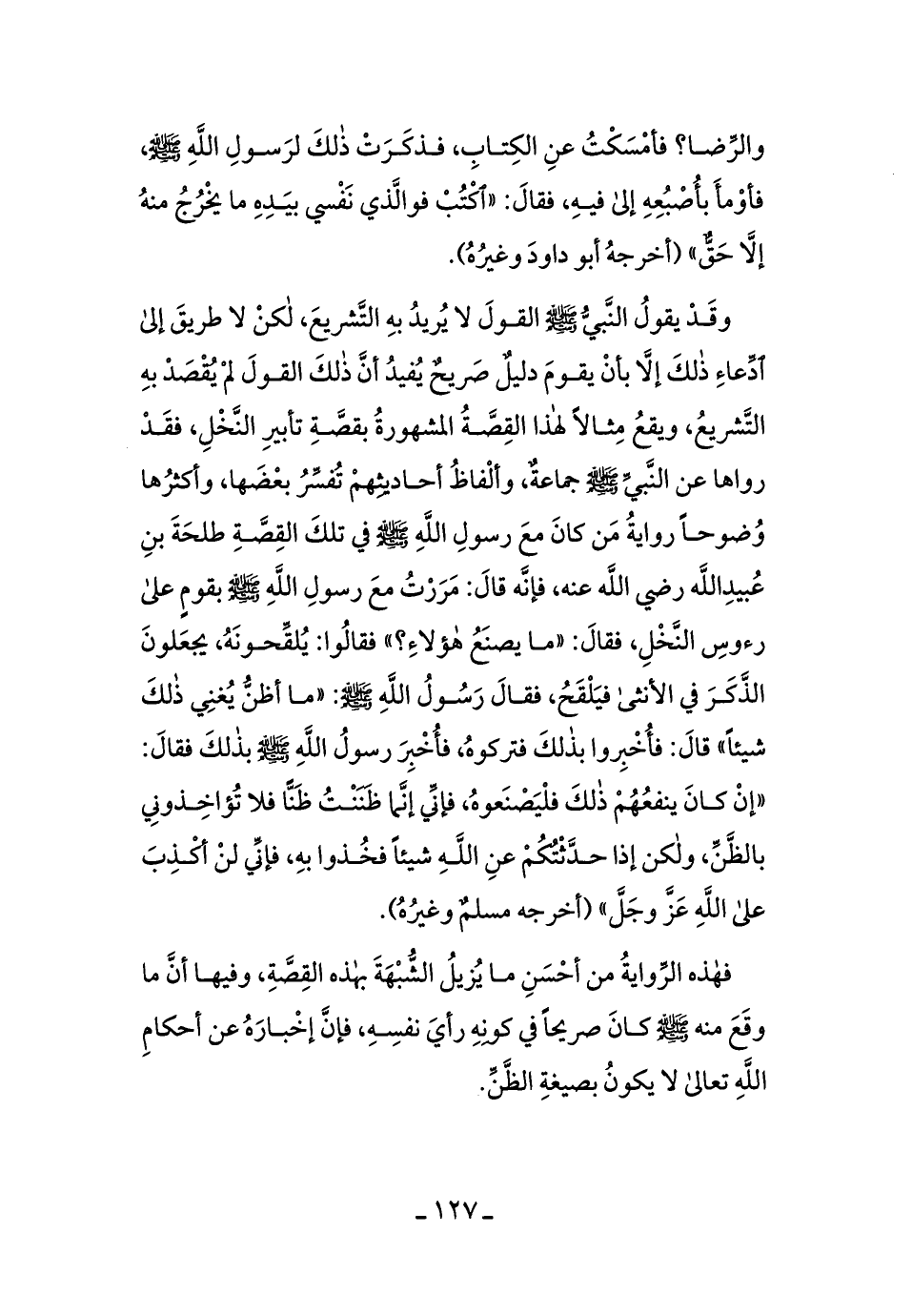 فهذه الرِّوايةُ من أحسنِ ما يُزيلُ الشُّبهَة بهذه القصَّة، وفيها أنَّ ما وقعَ منه - صلى الله عليه وسلم - كان صريحًا في كونِهِ رأيَ نفسِهِ، فإنَّ إخبارَهُ عن أحكامِ الله تعالى لا يكونُ بصيغةِ الظَّنِّ.