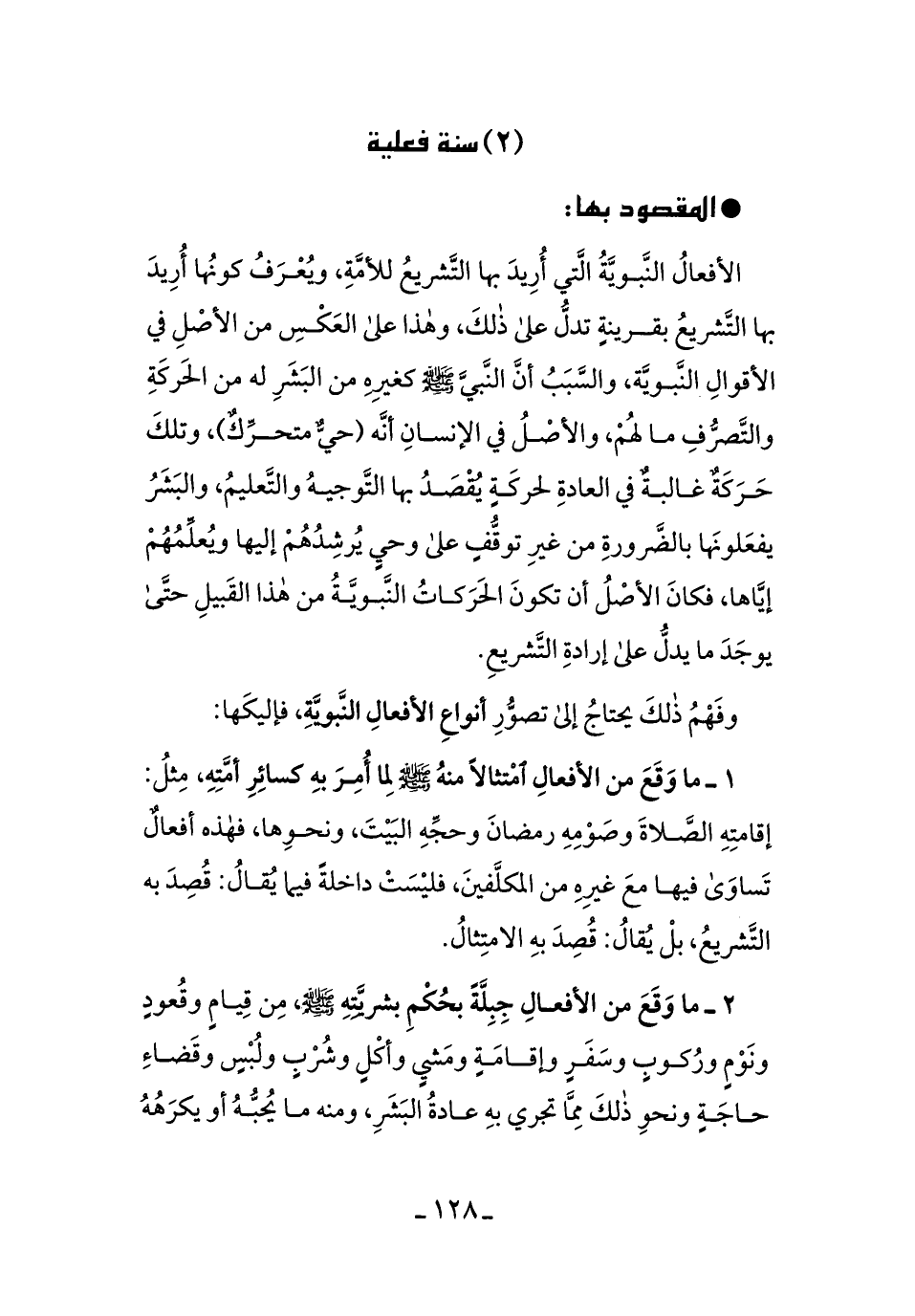 الأفعالُ النَّبويَّة الَّتي أُريد بها التَّشريعُ للأمَّةِ، ويُعرفُ كونُها أُريد بها التَّشريع بقرينةٍ تدلُّ على ذلك، وهذا على العكسِ من الأصل في الأقوالِ النَّبويَّة، والسَّببُ أنَّ النَّبي - صلى الله عليه وسلم - كغيرهِ من البشرِ له من الحركةِ والتَّصرُّف ما لهم، والأصلُ في الإنسانِ أنَّهُ (حيٌّ متحرِّكٌ) ، وتلك حركةٌ غالبَةٌ في العادةِ لحركةٍ يُقصدُ بها التَّوجيهُ والتَّعليمُ، والبشرُ يفعلونها بالضَّرورة من غير توقُّفٍ على وحيٍ يُرشدُهُم إليها ويُعلِّمهُم إيَّاها، فكان الأصلُ أن تكونَ الحركاتُ النَّبويَّةُ من هذا القبيلِ حتَّى يوجدَ ما يدلُّ على إرادةِ التَّشريعِ.