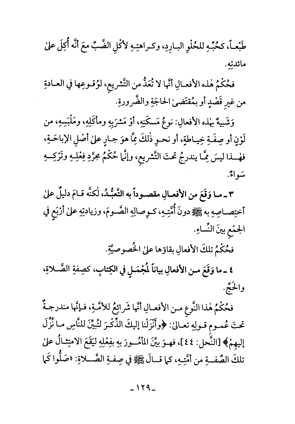 وشبيهُ بهذه الأفعالِ: نوعُ مسكنِهِ، أو مشربِه ومأكلِهِ، وملبسِهِ، من لونٍ أو صفةِ خياطَةٍ، أو نحو ذلك ممَّا هو جارٍ على أصلِ الإباحةِ، فهذا ليسَ ممَّا يندرجُ تحتَ التَّشريعِ، وإنَّما حكمُ مجرَّد فعلهِ وتركِهِ سواءٌ.