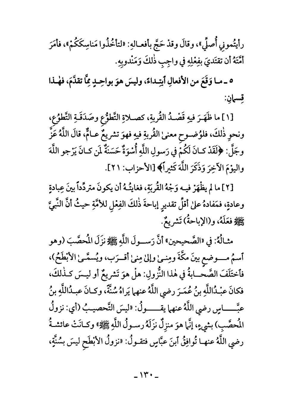 [1] ما ظهرَ فيه قصدُ القُربةِ، كصلاةِ التَّطوع وصدقةِ التَّطوُع، ونحو ذلك، فلوُضُوح معنى القُربَةِ فيه فهو تشريعٌ عامٌّ، قال الله عزَّوجلَّ: {لَقَدْ كَانَ لَكُمْ فِي رَسُولِ اللَّهِ أُسْوَةٌ حَسَنَةٌ لِمَنْ كَانَ يَرْجُو اللَّهَ وَالْيَوْمَ الْآَخِرَ وَذَكَرَ اللَّهَ كَثِيرًا} [الأحزاب: 21] .