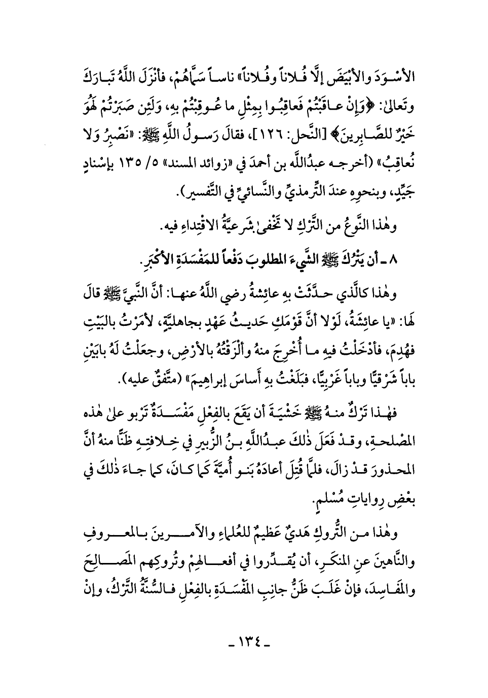 فهذا تركٌ منهُ - صلى الله عليه وسلم - خشيَةَ أن يقعَ بالفِعلِ مفسَدَةٌ تربُو على هذه المصلحَةِ، وقد فعلَ ذلكَ عبدُالله بن الزُّبيرِ في خلافَتِهِ ظنًّا منهٌُ أنَّ المحذُور قدْ زالَ، فلمَّا قُتلَ أعادَهُ بنُوأُميَّة كما كانَ، كما جاءَ ذلكَ في بعضِ رواياتِ مسلمٍ.