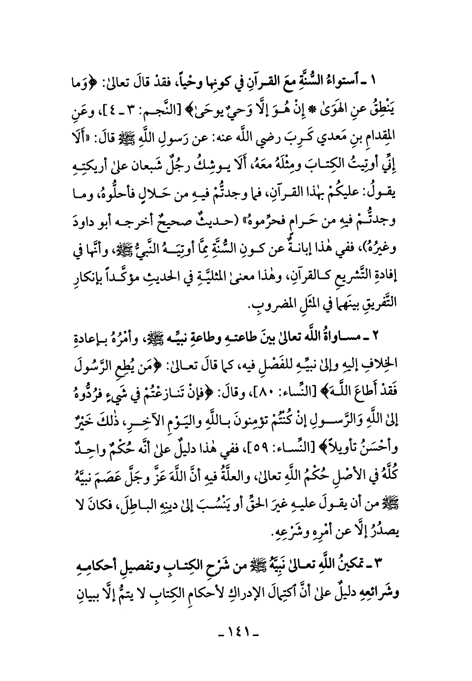 1ـ استواءُ السُّنَّة مع القرآنِ في كونهَا وحيًا، فقد قال تعالى: {وَمَا يَنْطِقُ عَنِ الْهَوَى (3) إِنْ هُوَ إِلَّا وَحْيٌ يُوحَى} [النجم: 3ـ4] ، وعنِ المِقدامِ بنِ معدي كرِبَ رضي الله عنهُ: عن رسول الله - صلى الله عليه وسلم - قال: ((ألاَ إنِّي أوتيتُ الكتابَ ومثلهُ معهُ، ألاَ يُوشكُ رجلٌ شبعانَ على أريكته يقولُ: عليكُم بهذا القرآنِ، فما وجدتُّم فيه من حلالٍ فأحلُّوهُ، ما وجدتُّم فيه من حرامٍ فحرِّمُوهُ)) [حديثٌ صحيحٌ أخرجه أبوداود وغيرُه] ، ففي هذا إبانَةٌ عن كونِ السُّنَّةِ ممَّا أُوتيَهُ النَّبيُّ - صلى الله عليه وسلم -، وأنَّها في إفادَةِ التَّشريعِ كالقُرآنِ، وهذا معنى المثليَّةِ في الحديثِ مؤكَّدًا بإنكارِ التَّفريقِ بينهمَا في المثلِ المضروبِ.