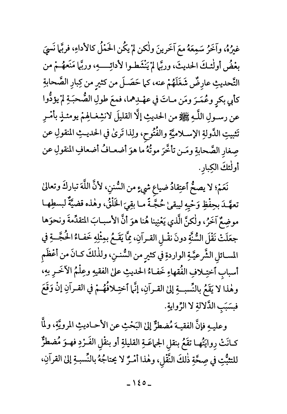 نعمْ؛ لا يصحُّ اعتقادُ ضياعِ شيءٍ من السُّننِ، لأنَّ الله تباركَ وتعالى تعهَّدَ بحفظِ وحيِهِ لِيبقَى حُجَّةً ما بقيَ الخلقُ، وهذه قضيَّةٌ لبسطِهَا موضعٌ آخرُ، ولكنَّ الَّذي يعنِينا هُنا هوَ أنَّ الأسبابَ المتقدِّمَةَ ونحوَها جعلتْ نقلَ السُّنَّةِ دونَ نقلِ القرآنِ، ممَّا يقعُ بمثلهِ خفاءُ الحُجَّةِ في المسائلِ الشَّرعيَّةِ الواردَةِ في كثيرٍ من السُّننِ، ولذلكَ كان من أعظمِ أسبابِ اختلافِ الفُقهاءِ خفاءُ الحديثِ على الفقيهِ وعلمُ الآخرِ بهِ، وهذا لا يقعُ بالنِّسبةِ إلى القرآنِ، إنَّما اختلافُهُم في القرآنِ إنْ وقعَ فبِسببِ الدَّلالةِ لا الرِّوايةِ.